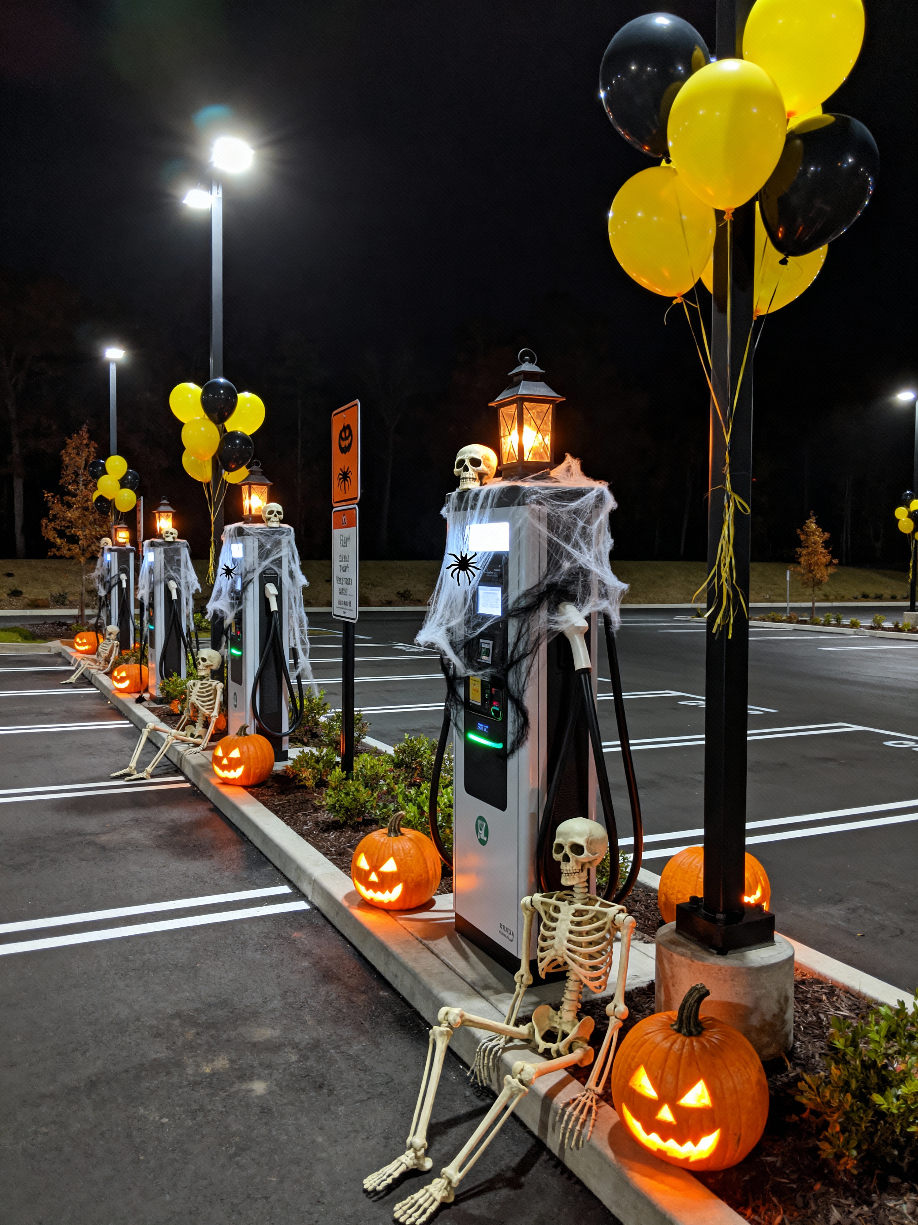 parking lot with halloween style with parking lot and ev charging stations and payment kiosks and signage and landscaping elements and lighting poles and parking lot and drive lanes. . with lanterns and cobwebs and glowing pumpkins and spiderwebs and human skulls and yellow black balloons and lanterns and skeletons sitting and standing