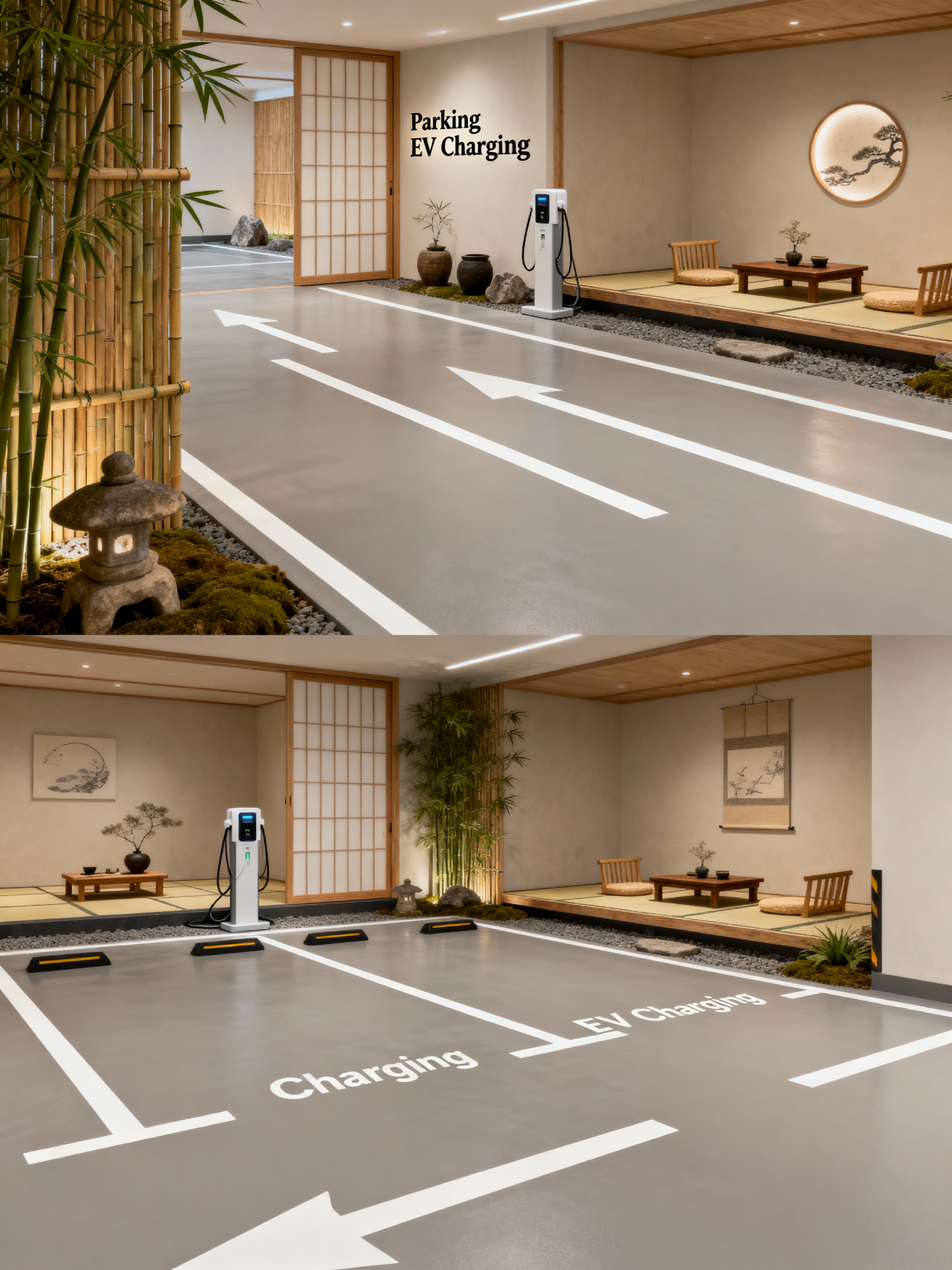 parking lot with japanese design style with parking lot and signage and landscaping elements and ev charging stations and parking lot and drive lanes and markings and white parking lot stripes. . with low furniture and bamboo accents and zen decor and natural materials and minimalism and tranquility and sliding doors and wabi-sabi