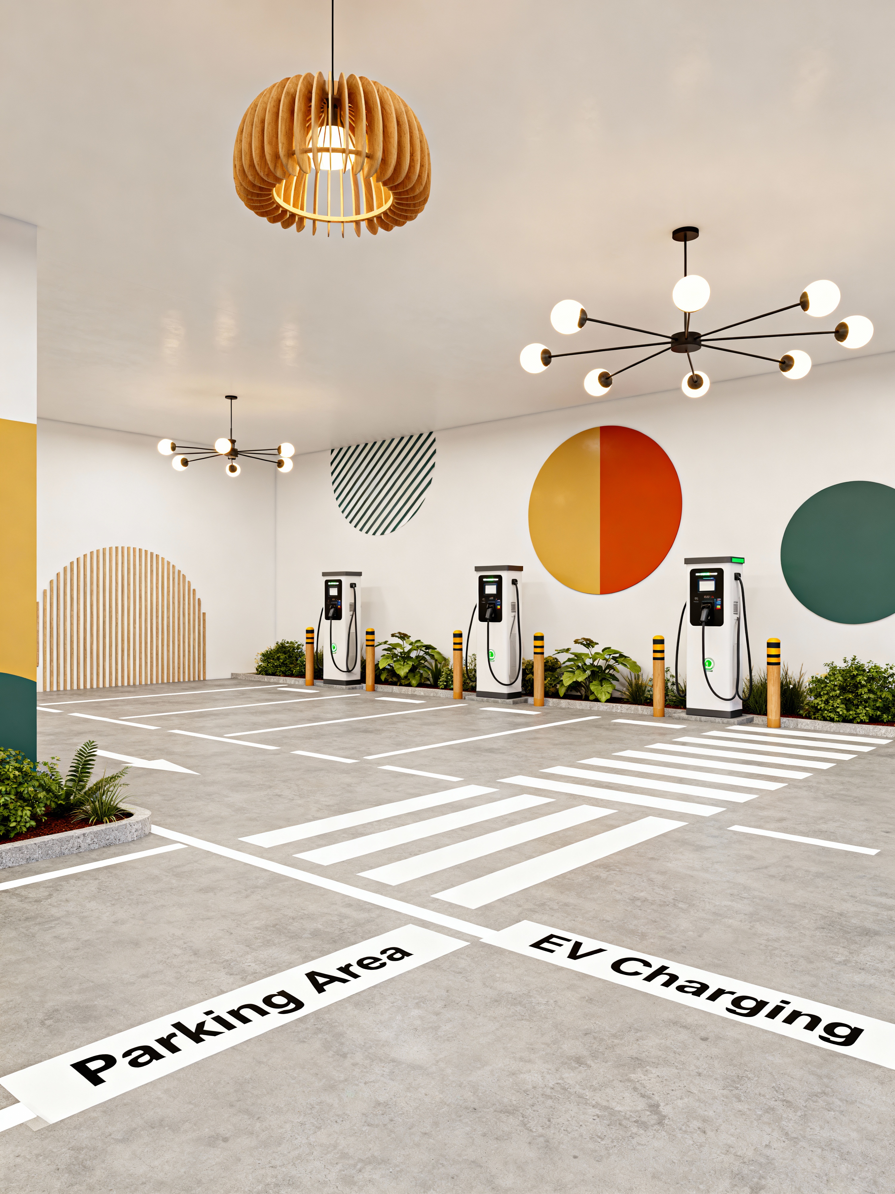 parking lot with midcentury modern style with parking lot and ev charging stations and landscaping elements and white parking lot stripes and signage and payment kiosks and drive lanes and parking lot. . with clean lines and integrating indoor and outdoor motifs and minimalist and vibrant colors and wood pendant light mid century modern chandelier and graphic shapes and mid century modern mobile chandelier and function over form