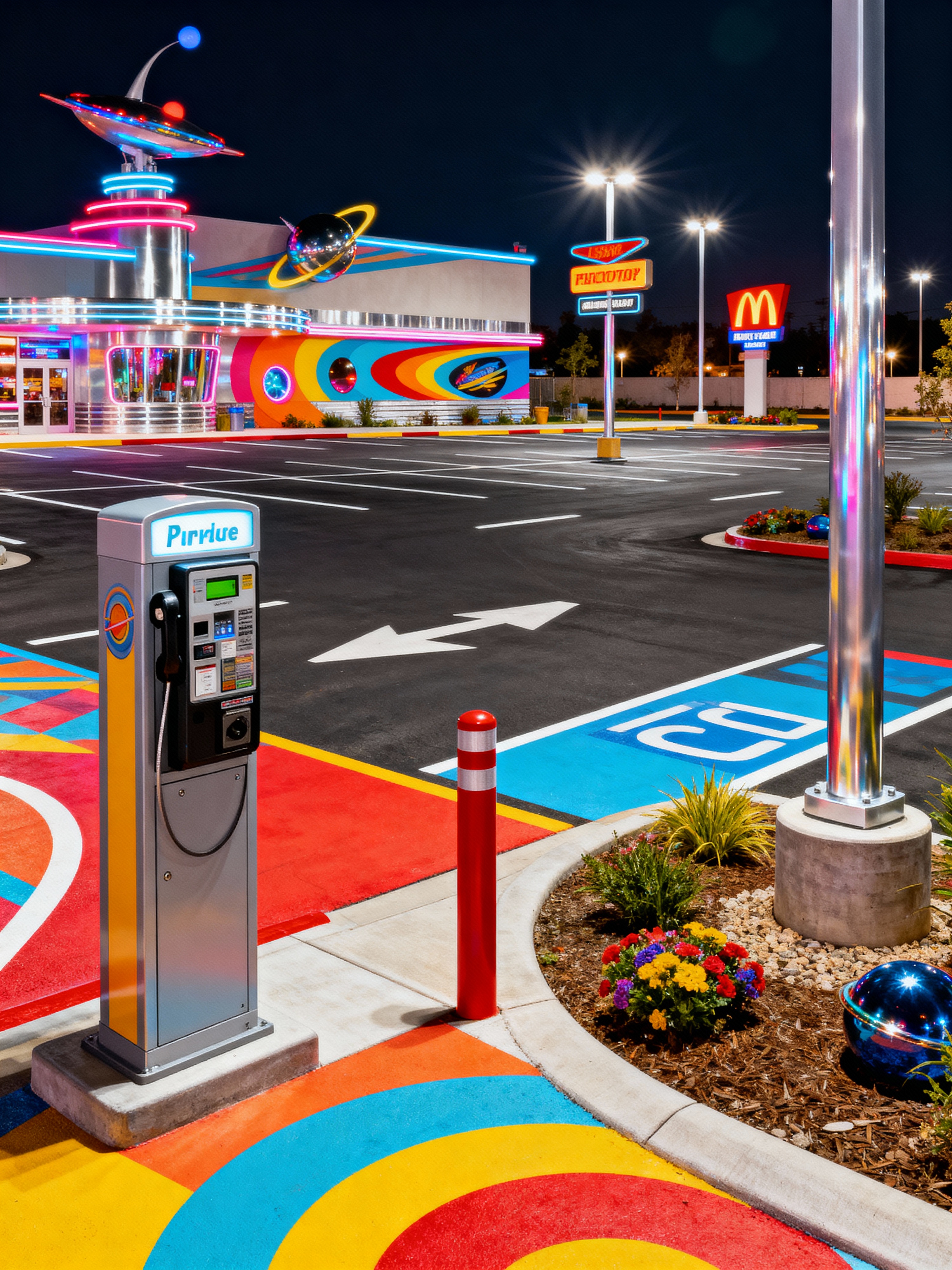 parking lot with retro style with parking lot and payment kiosks and markings and signage and drive lanes and lighting poles and landscaping elements and parking lot. . with nostalgic pieces and bold patterns and space age and chrome accents and vintage revival and funky decor and groovy vibes and bright colors
