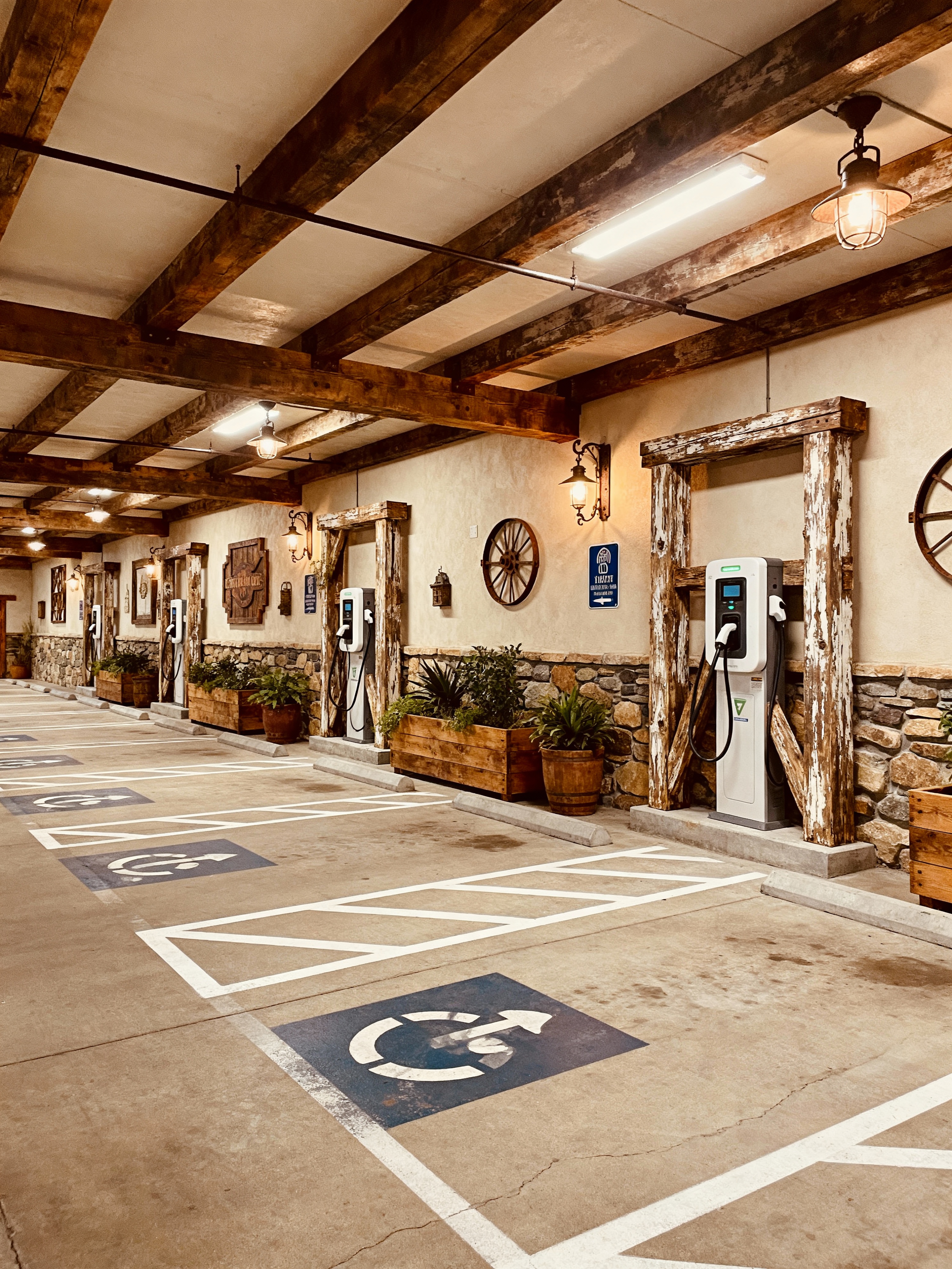 parking lot with rustic style with signage and markings and parking lot and white parking lot stripes and landscaping elements and ev charging stations and drive lanes and parking spaces. . with distressed finishes and natural wood and vintage decor and warmth and exposed beams and stone accents and iron fixtures and earthy tones