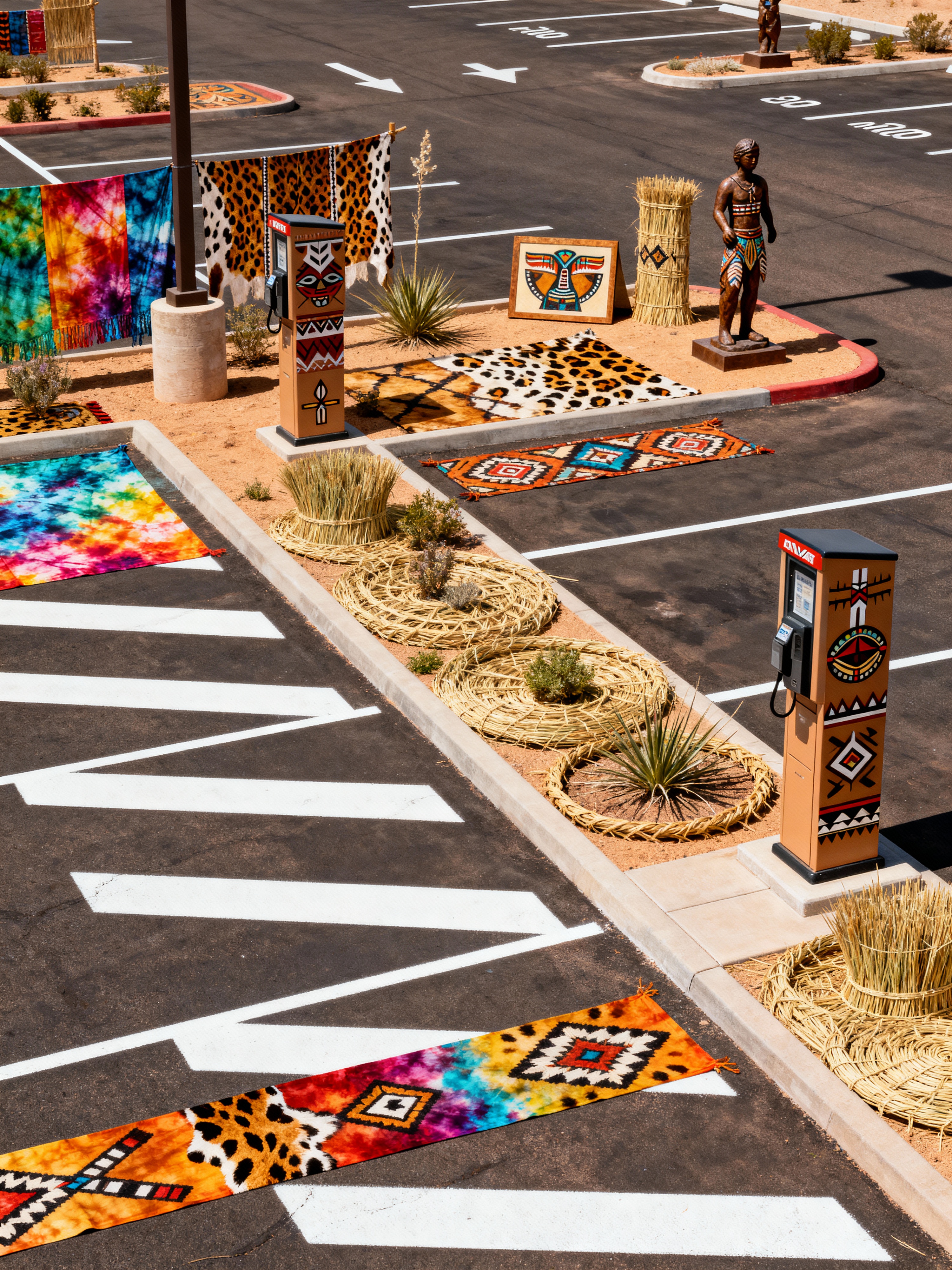 parking lot with tribal style with drive lanes and landscaping elements and markings and parking spaces and parking lot and parking lot and payment kiosks and white parking lot stripes. . with exuberant splashes of colour and desert colours and hand dyed batik fabrics and animal prints and intricate grass weaving and sculptures and artworks and tribal revival and tribal patterns