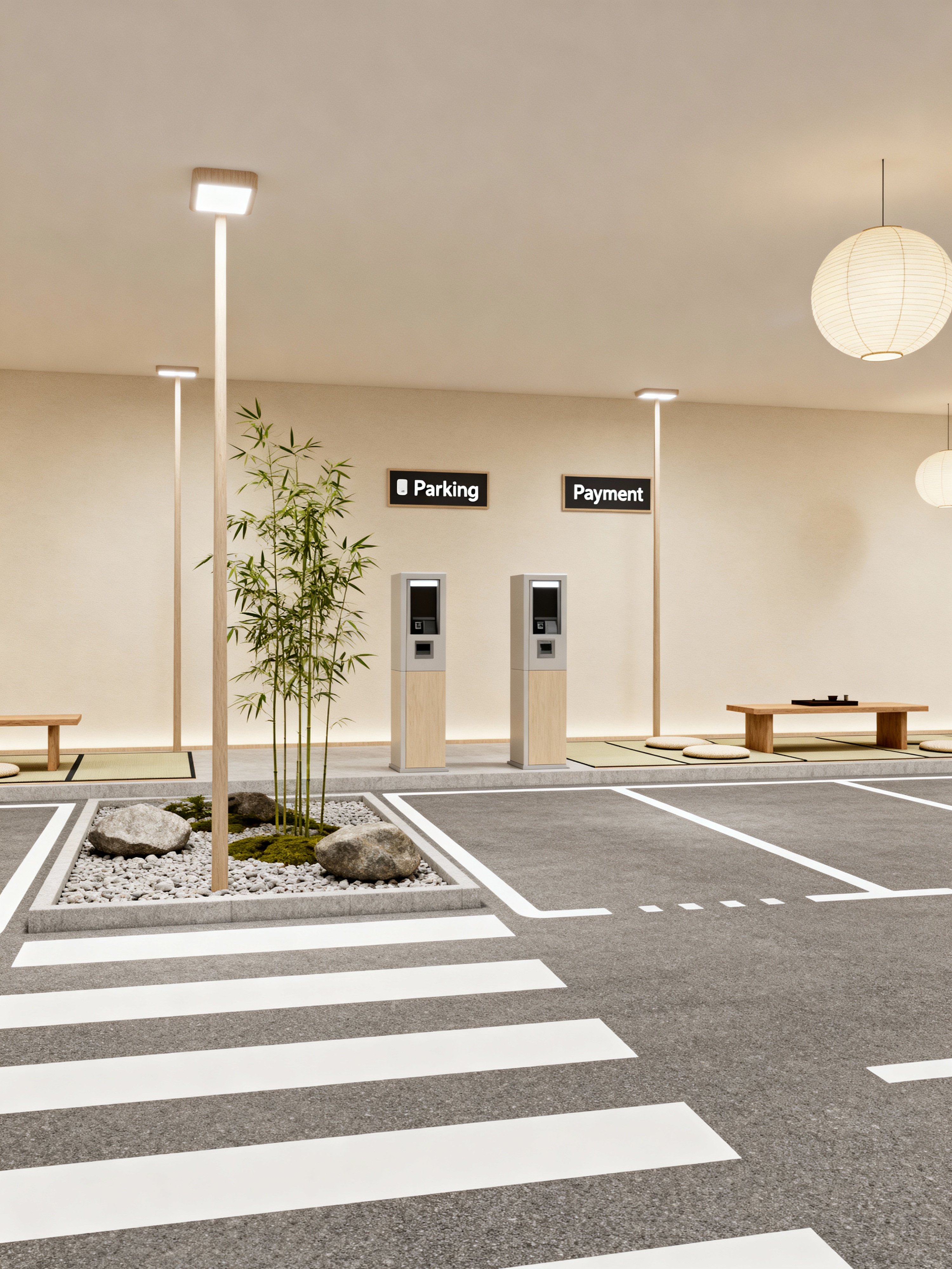 parking lot with zen style with white parking lot stripes and markings and signage and landscaping elements and parking lot and payment kiosks and drive lanes and lighting poles. . with simple furniture and asian zen interior and clutter free and japanese minimalist interior and japanese minimalist interior and japanese minimalist interior and serenity and harmony and calm and neutral colors