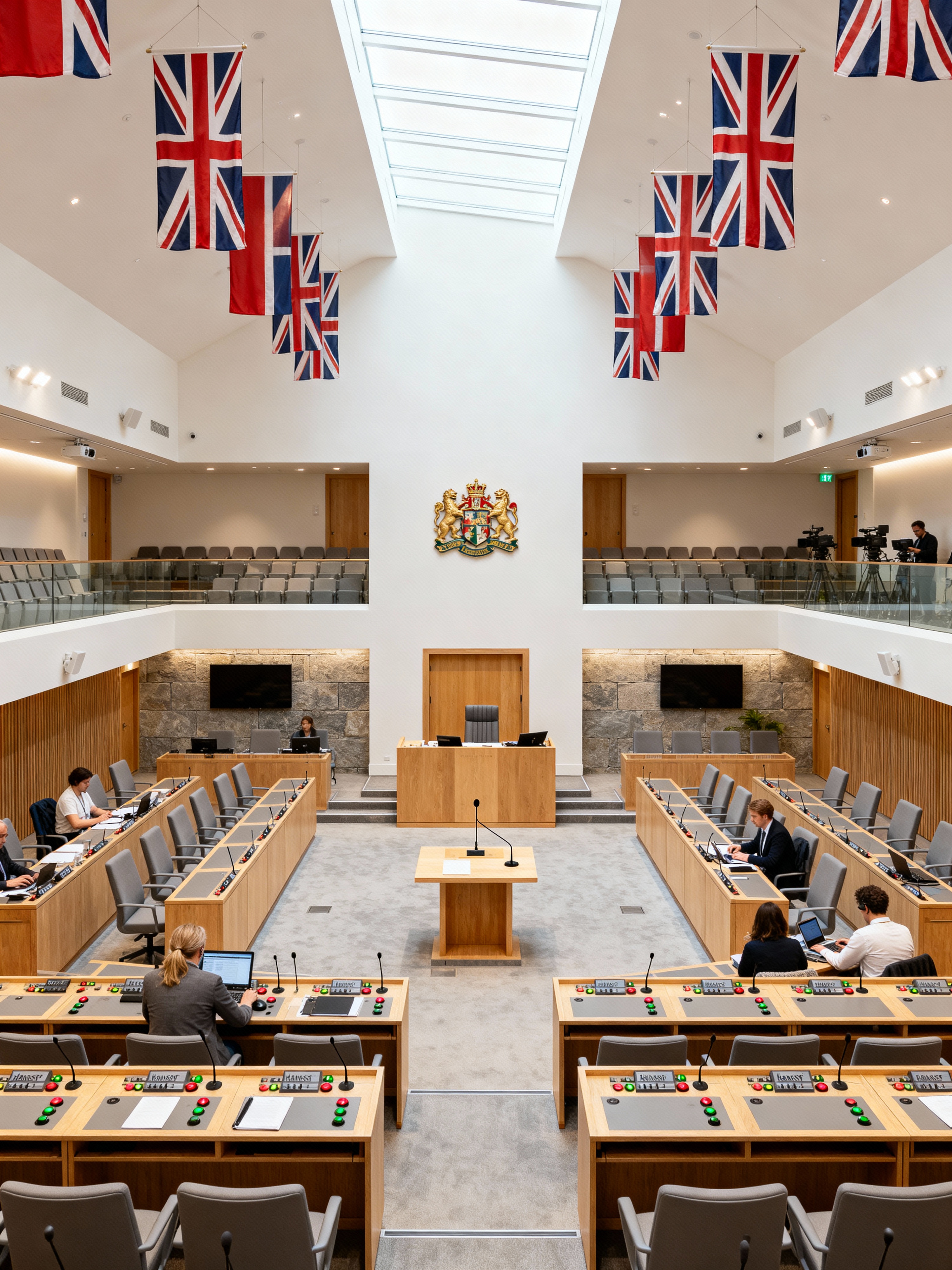 parliament with airbnb style with voting buttons and hansard reporters and press gallery and parliamentary seats and speaker podium and gallery seating and flags and coat of arms. . with natural materials and elements and neutral walls and textures and practicality and functionality and open and natural lighting and simple, clean lines and simplistic furniture and simple color palette and scandinavian style and natural materials and elements