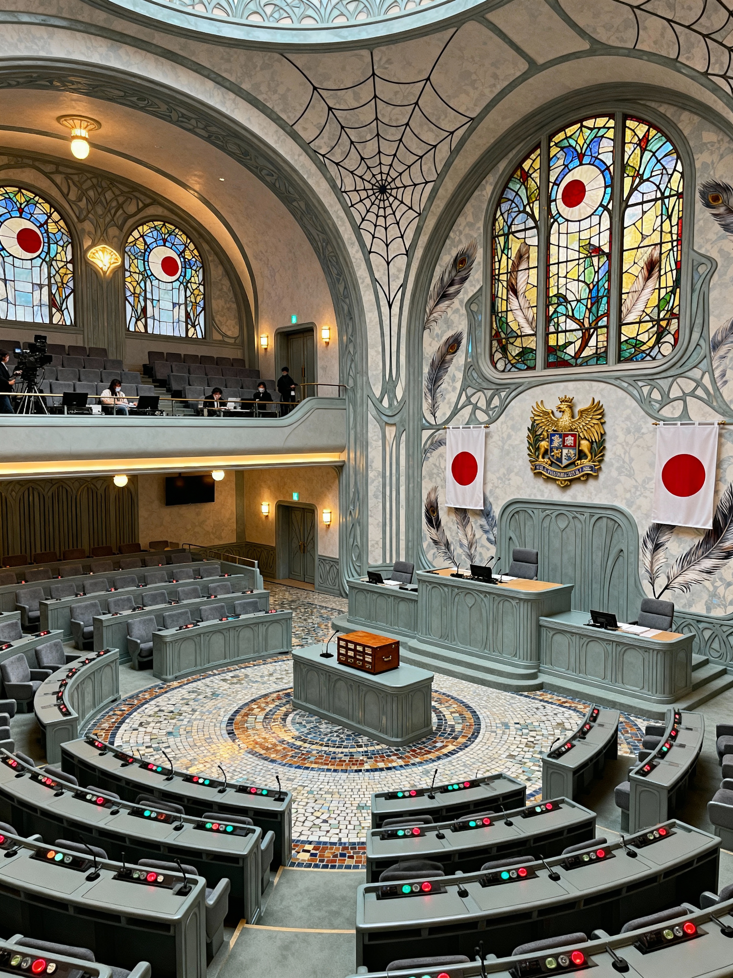 parliament with art nouveau style with flags and voting buttons and parliamentary seats and press gallery and gallery seating and speaker podium and dispatch boxes and coat of arms. . with arches and curved forms and soft, rounded lines and wallpaper pattners of spider webs and ashy colors and wallpaper patterns of feathers and mosaics and stained glass and japanese motifs
