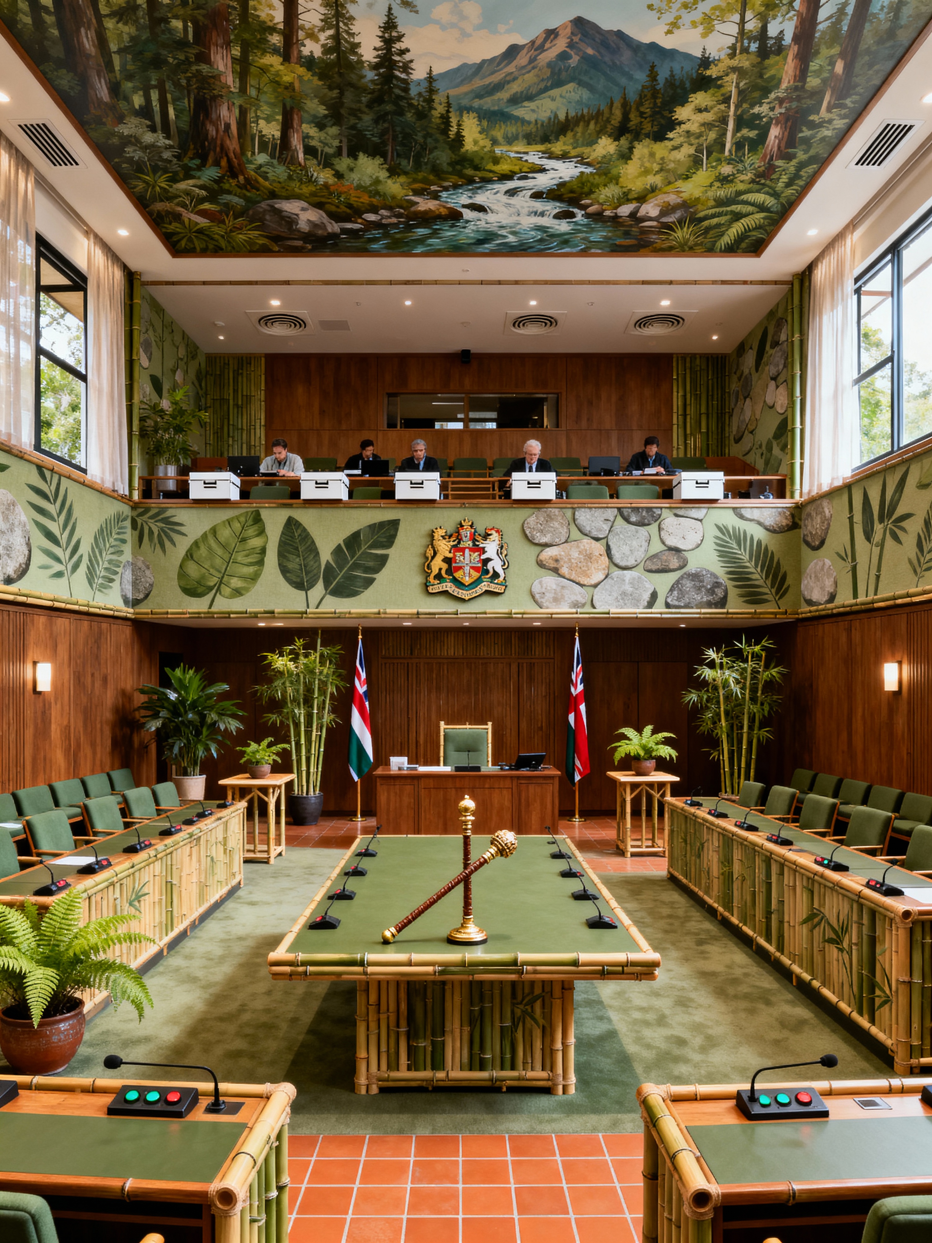 parliament with biophilic style with gallery seating and ceremonial mace and flags and voting buttons and press gallery and hansard reporters and dispatch boxes and coat of arms. . with images of nature and natural patterns and fresh air and plants and ceramic materials and bamboo materials and earthy colors and calming style