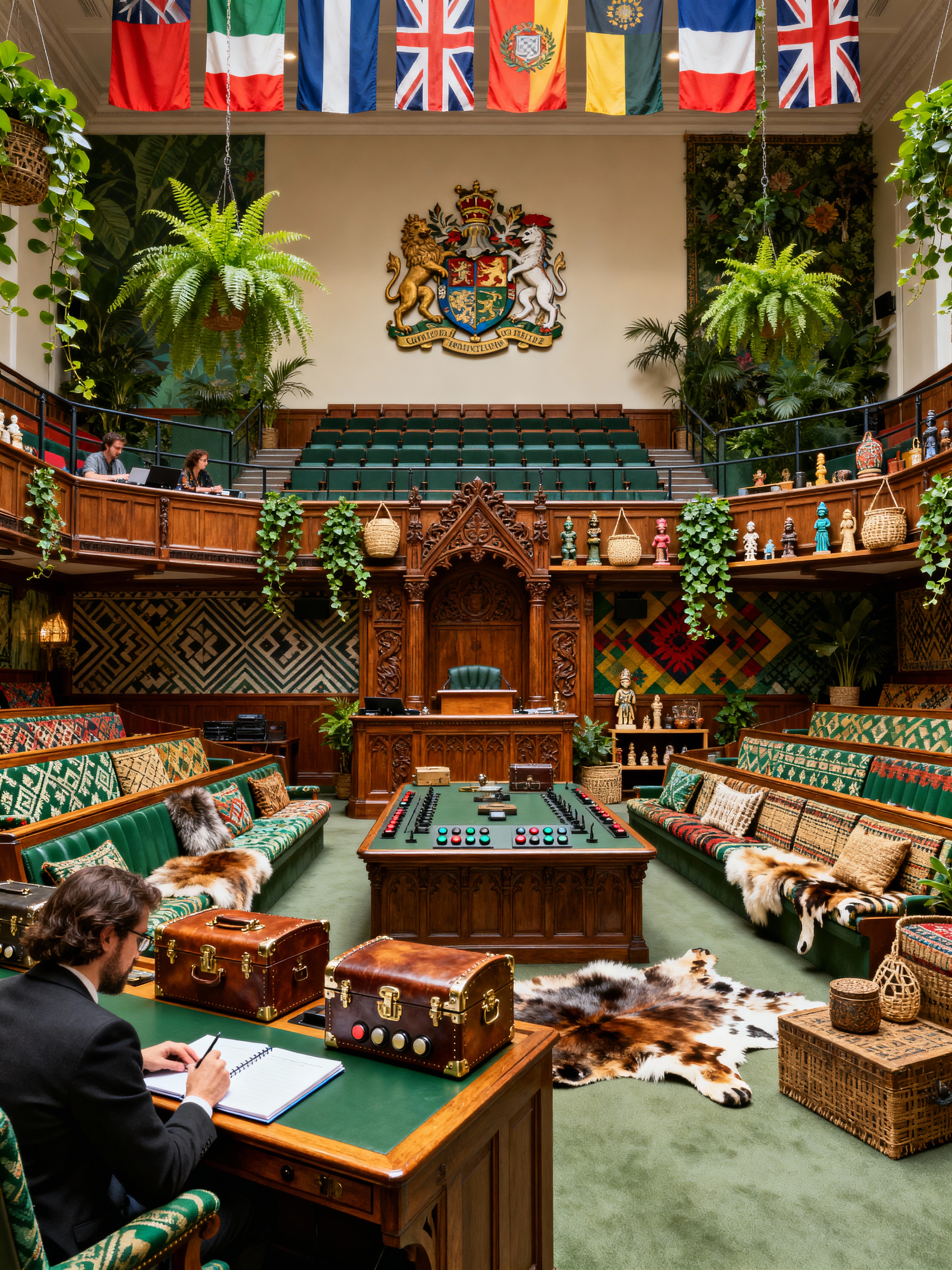 parliament with bohemian style with coat of arms and press gallery and speaker podium and voting buttons and flags and dispatch boxes and hansard reporters and parliamentary seats. . with woods and animal hides and travel trinkets and metals and carefree layers of pattern, texture, and color and lush green nature and natural materials and bold patterns