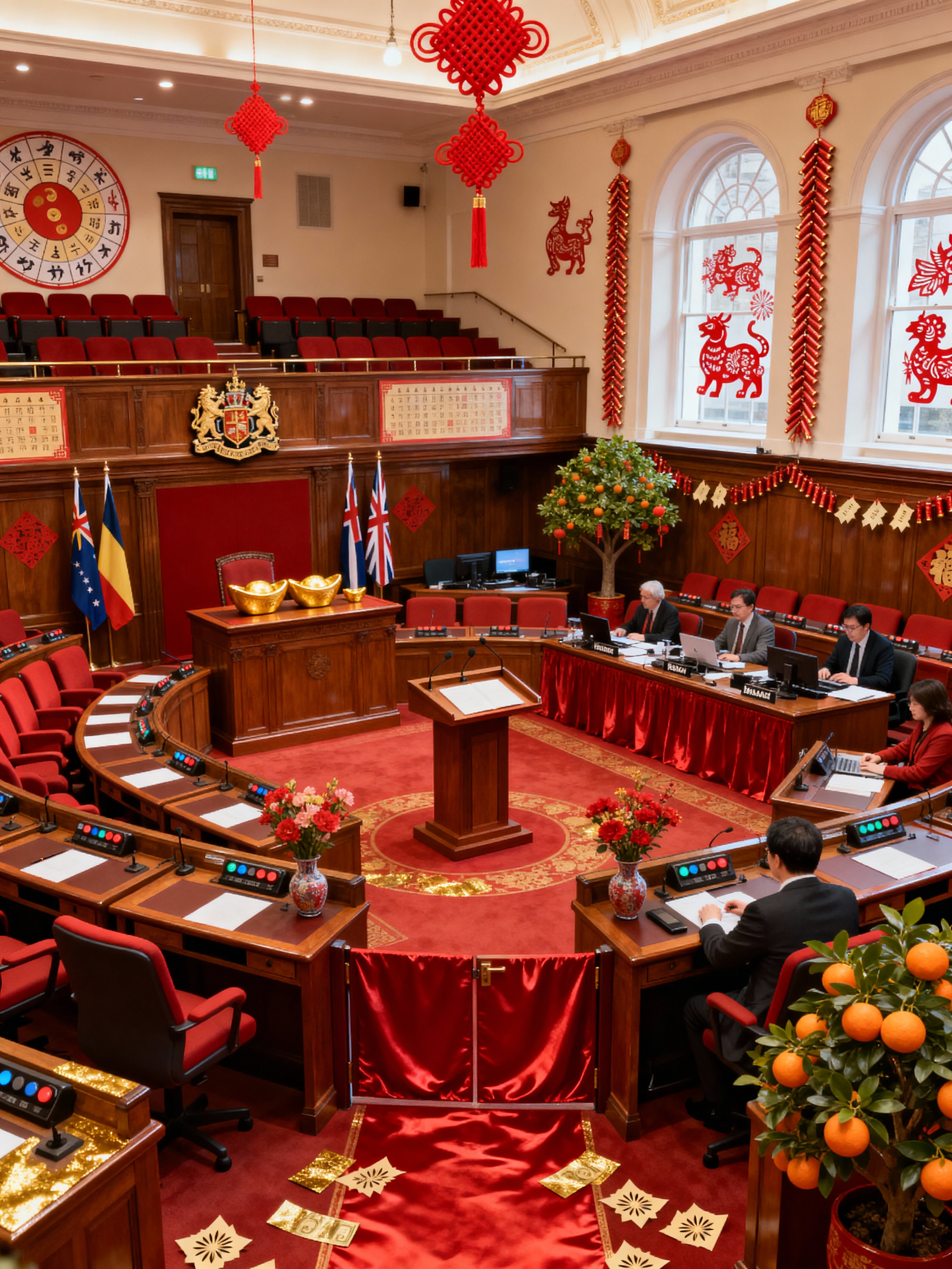 parliament with chinese new year style with parliamentary seats and speaker podium and press gallery and coat of arms and voting buttons and flags and gallery seating and hansard reporters. . with money tree and chinese knots and zodiac calendar and gold ingots and mei hwa flowers and paper cuttings and paper firecrackers and orange trees