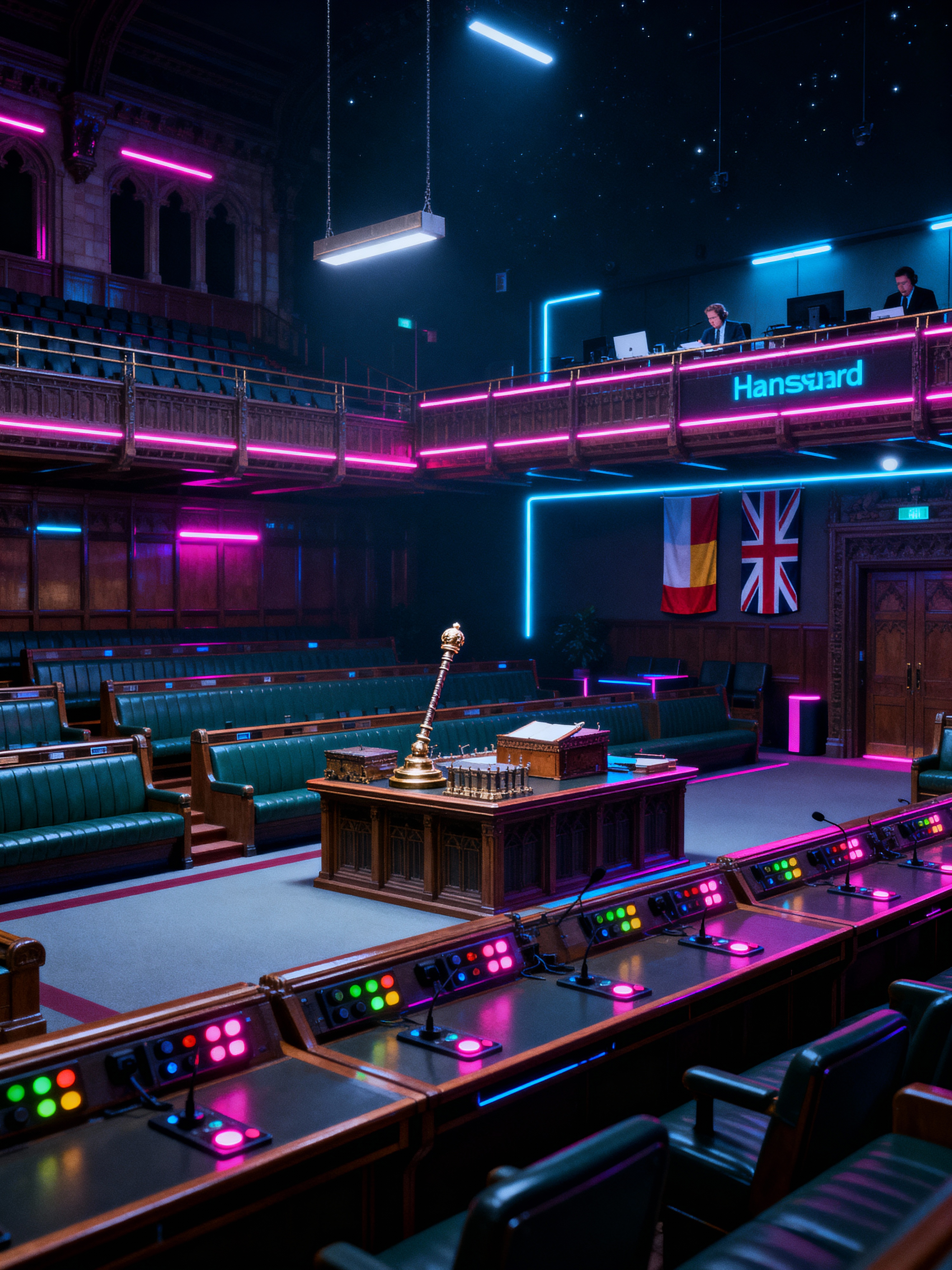 parliament with cyberpunk style with voting buttons and parliamentary seats and flags and gallery seating and ceremonial mace and press gallery and hansard reporters and speaker podium. . with dark night and bladerunner lights and synthetic objects and black lights and minimalist and cyberpunk style and synthwave and color lights glow