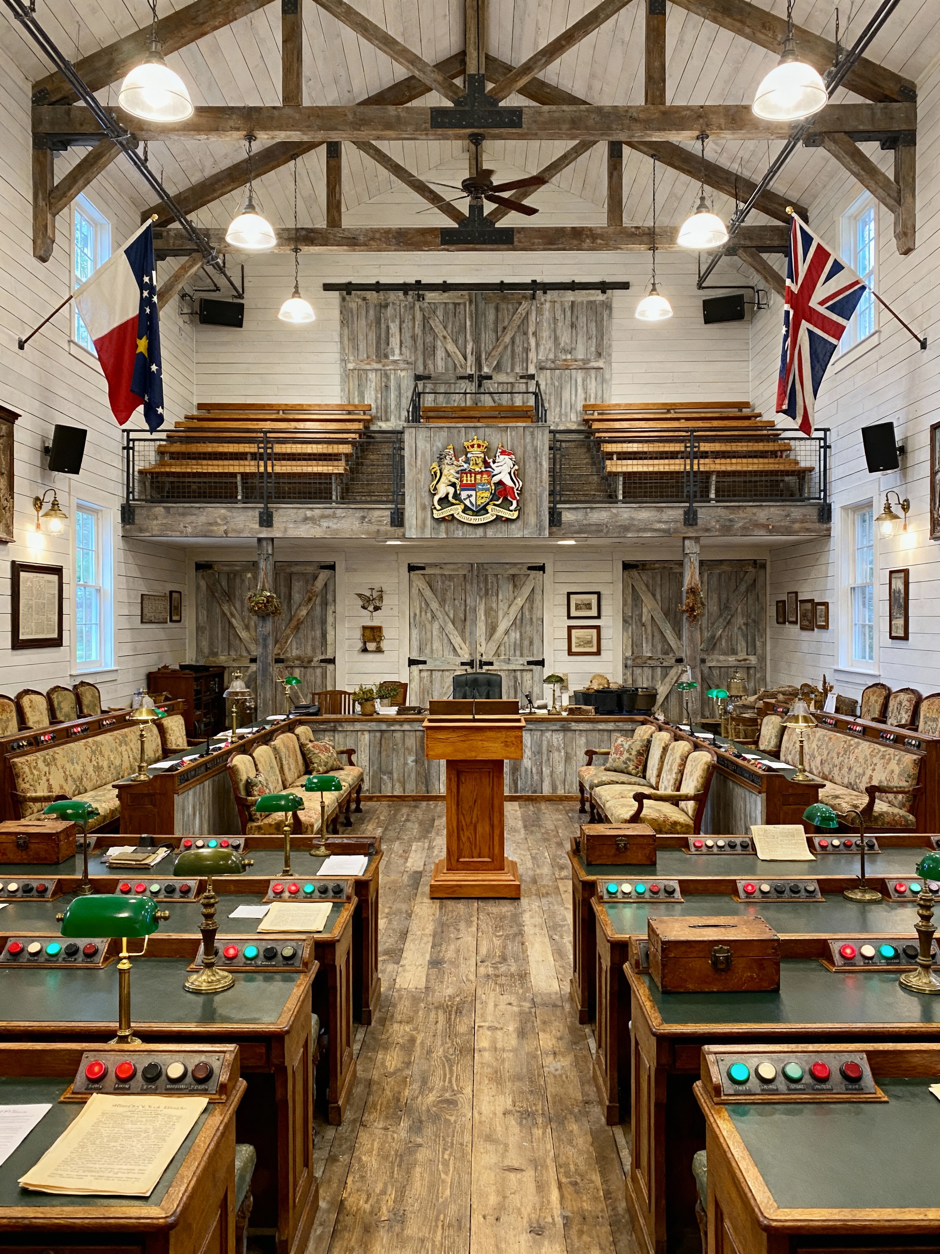 parliament with farmhouse style with flags and press gallery and gallery seating and coat of arms and voting buttons and parliamentary seats and dispatch boxes and speaker podium. . with vintage decor and neutral tones and industrial accents and shiplap walls and country style and exposed wood and barn doors and rustic charm