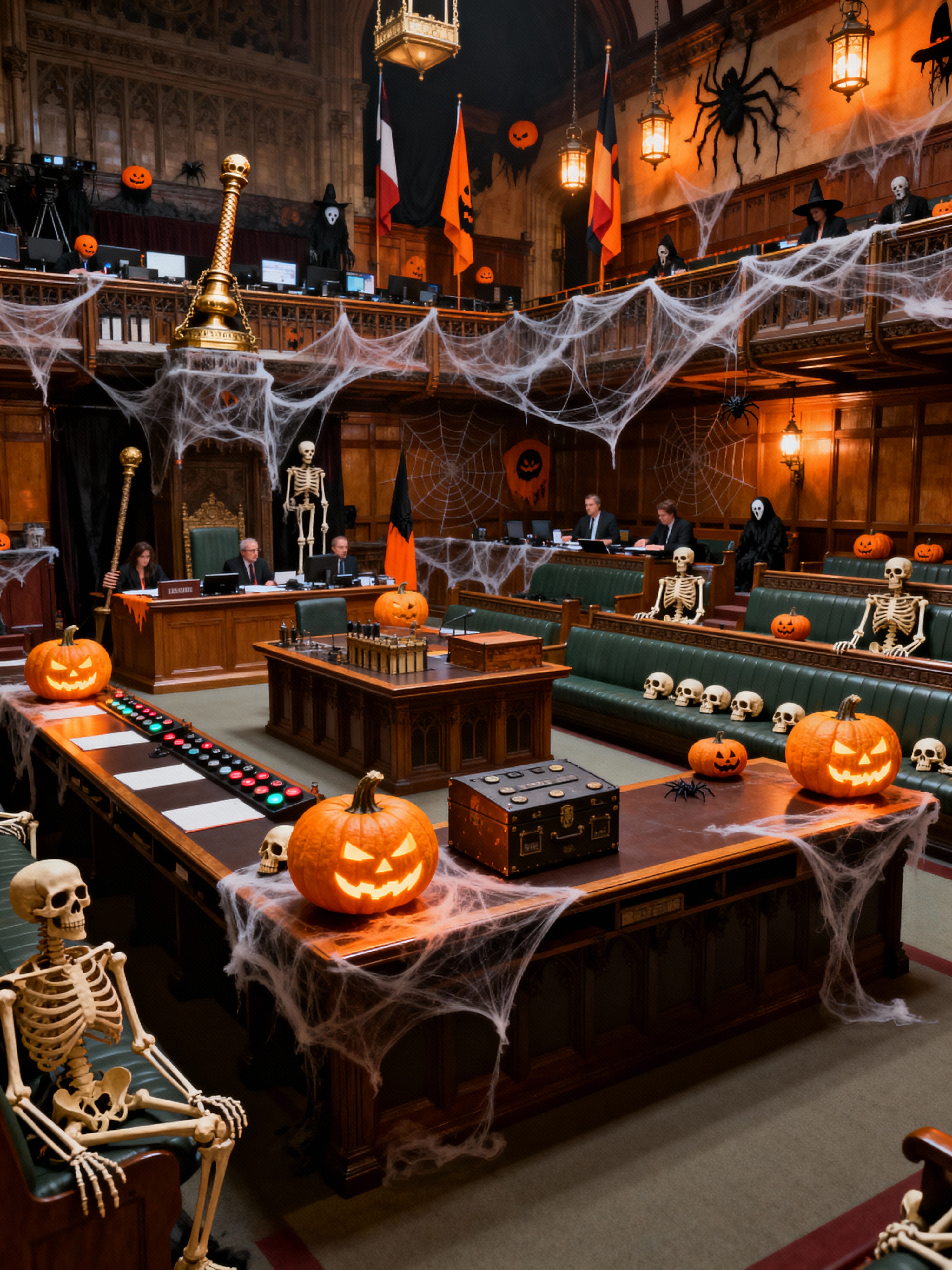 parliament with halloween style with ceremonial mace and press gallery and gallery seating and flags and hansard reporters and speaker podium and voting buttons and dispatch boxes. . with spiderwebs and lanterns and lanterns and skeletons sitting and standing and cobwebs and cobwebs and glowing pumpkins and human skulls