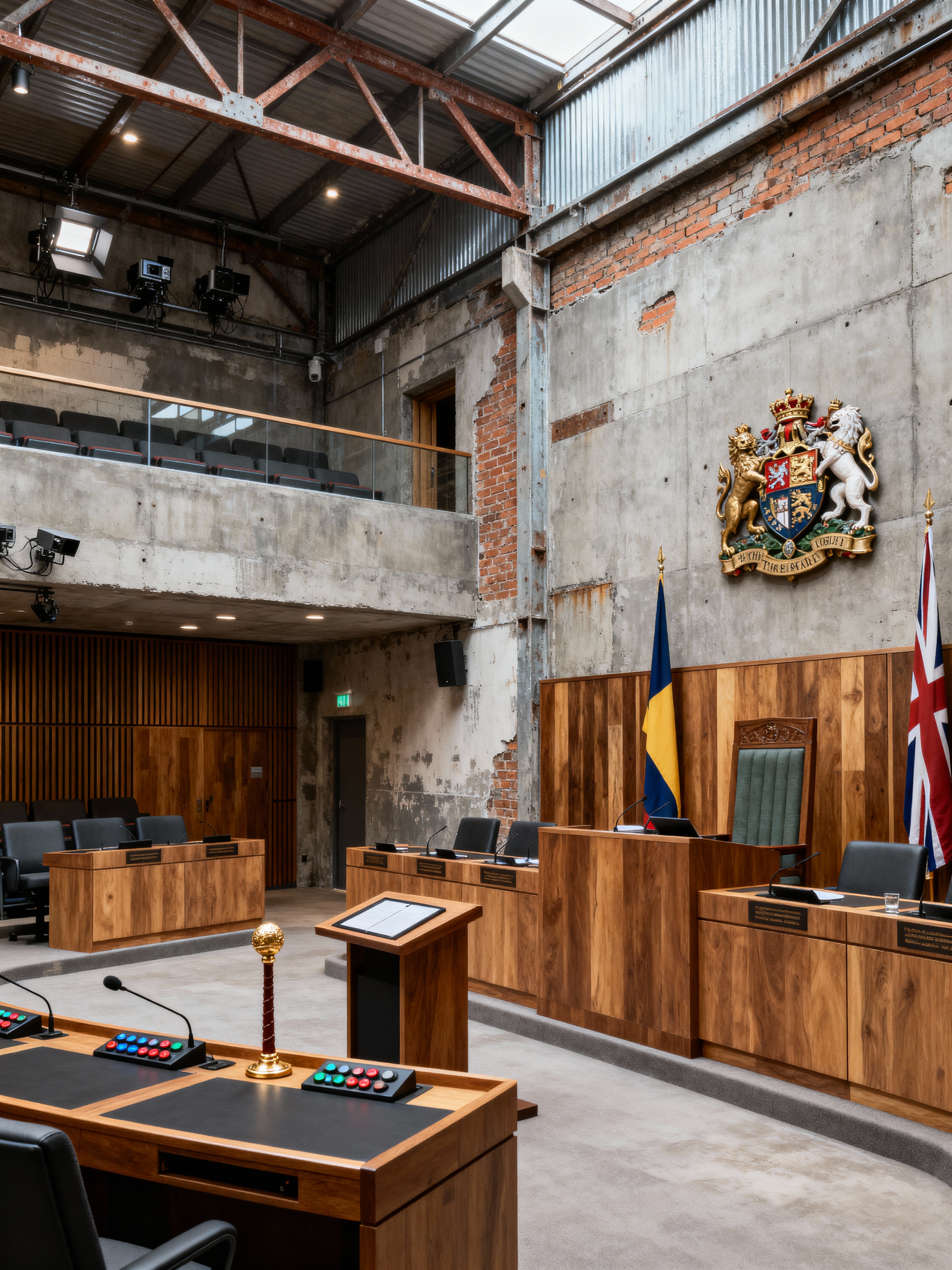 parliament with industrial style with press gallery and coat of arms and parliamentary seats and gallery seating and ceremonial mace and voting buttons and speaker podium and flags. . with exposed concrete and utilitarian objects and raw aesthetic and metal panels and reclaimed wood and exposed rafters and exposed brick and factory style
