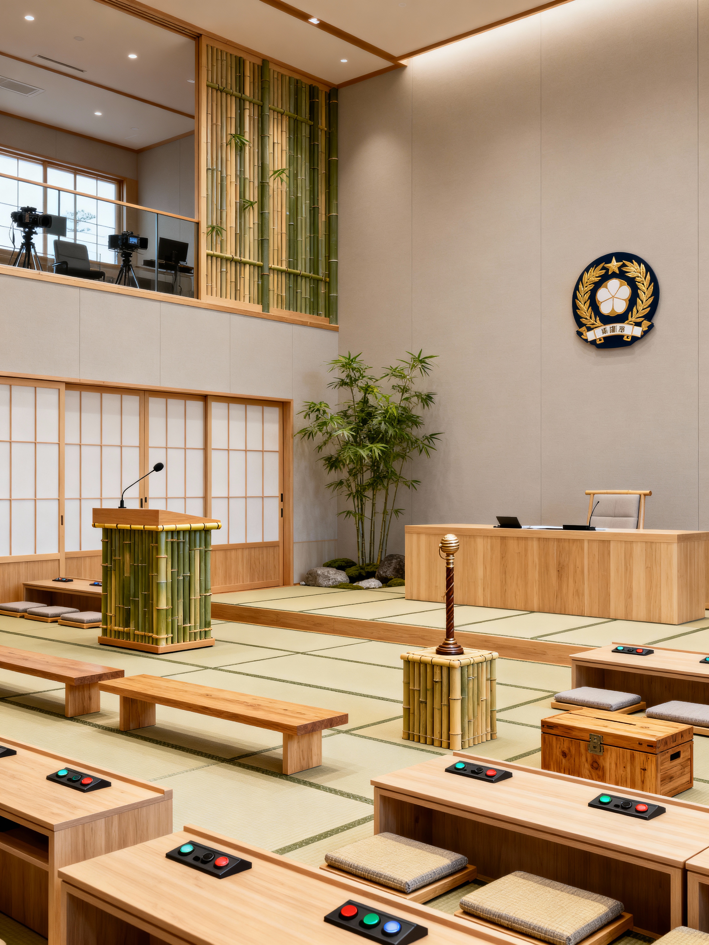 parliament with japanese design style with press gallery and speaker podium and coat of arms and voting buttons and gallery seating and ceremonial mace and parliamentary seats and dispatch boxes. . with natural materials and sliding doors and bamboo accents and zen decor and neutral colors and tatami mats and minimalism and indoor plants