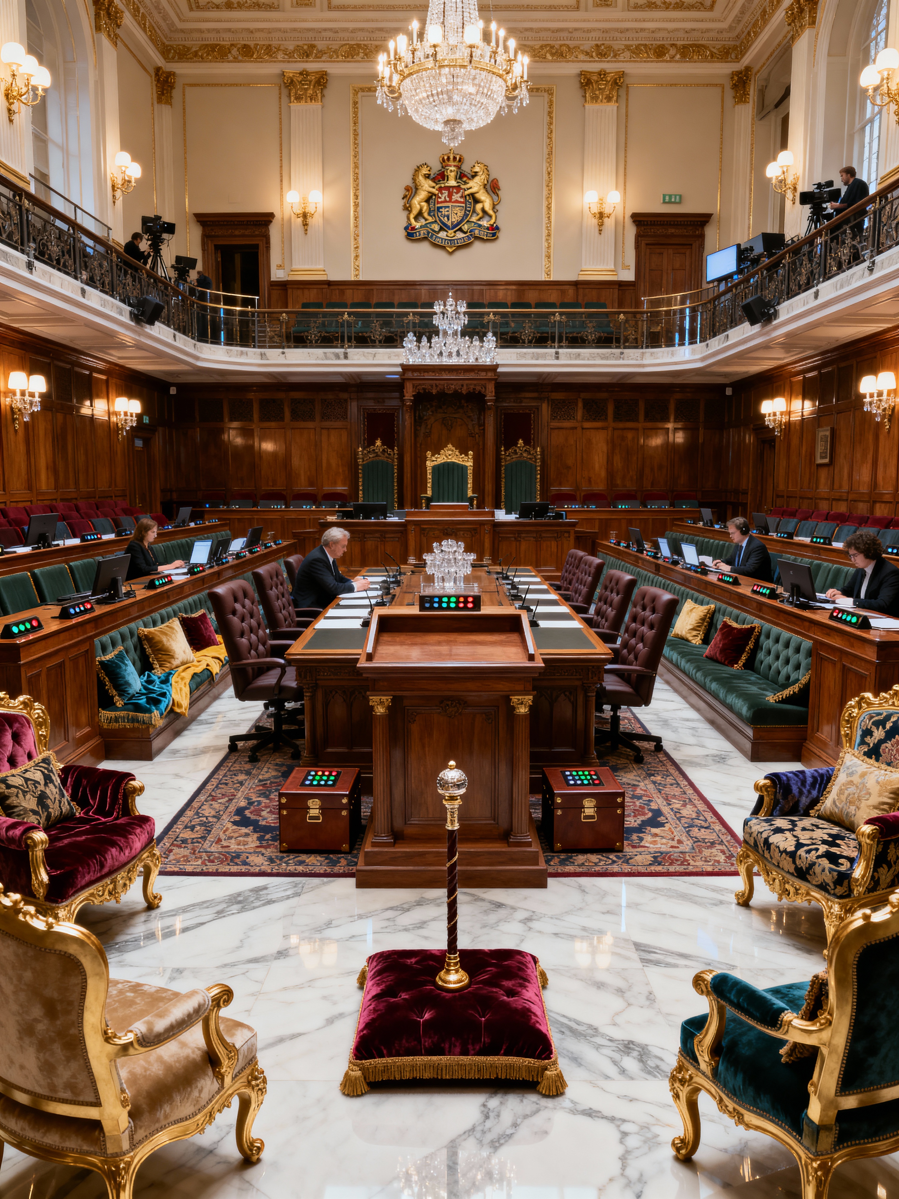 parliament with luxury style with dispatch boxes and hansard reporters and voting buttons and ceremonial mace and gallery seating and speaker podium and press gallery and coat of arms. . with elegant lighting and premium finishes and high-end materials and opulent details and designer furniture and lavish comfort and expensive fabrics and custom pieces