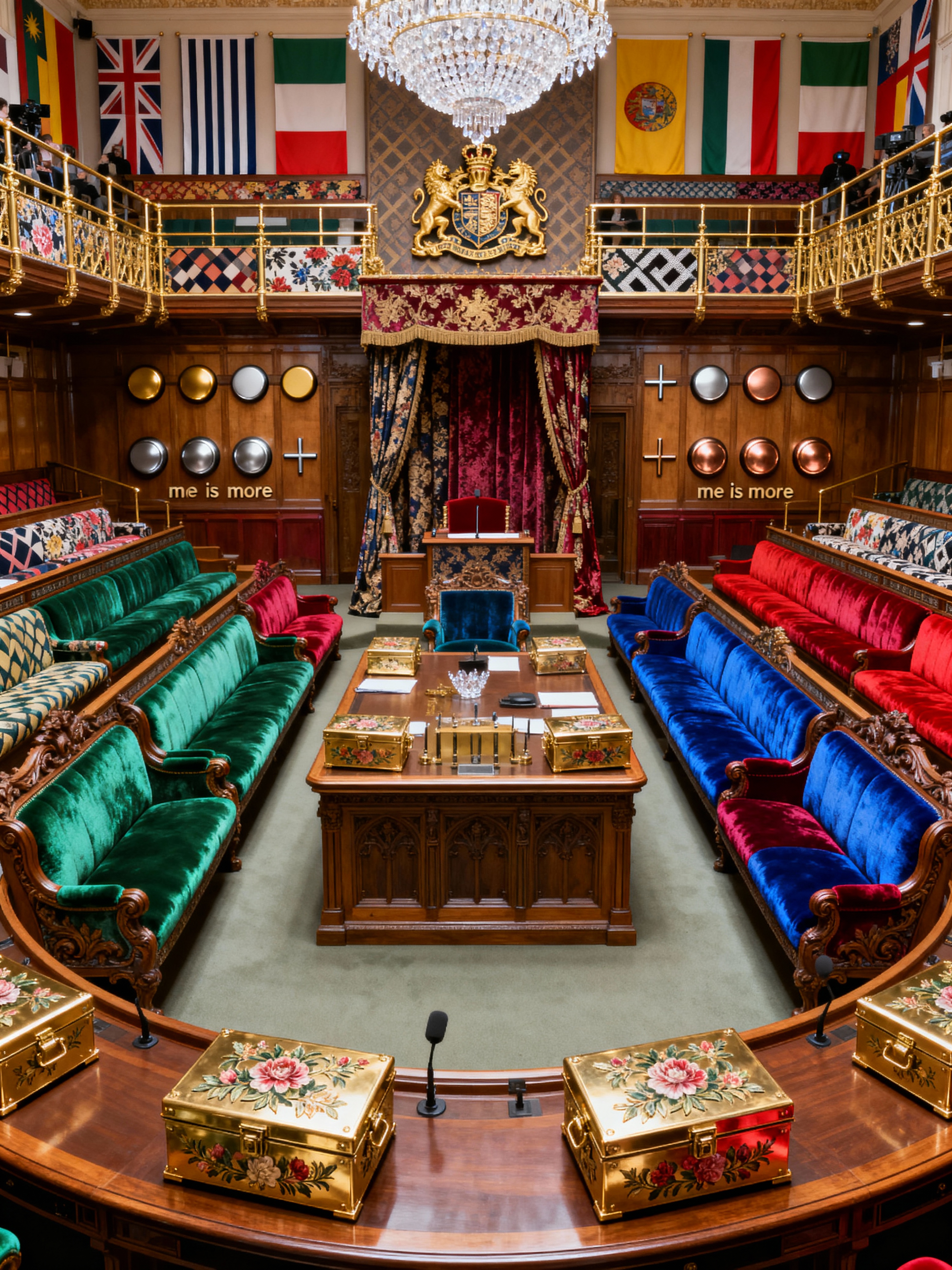 parliament with maximalist style with parliamentary seats and dispatch boxes and press gallery and gallery seating and coat of arms and speaker podium and flags and voting buttons. . with playful and over-the-top aesthetic and more is more philosophy and eye-catching and bold creativity and vibrant and bold colors and bold design