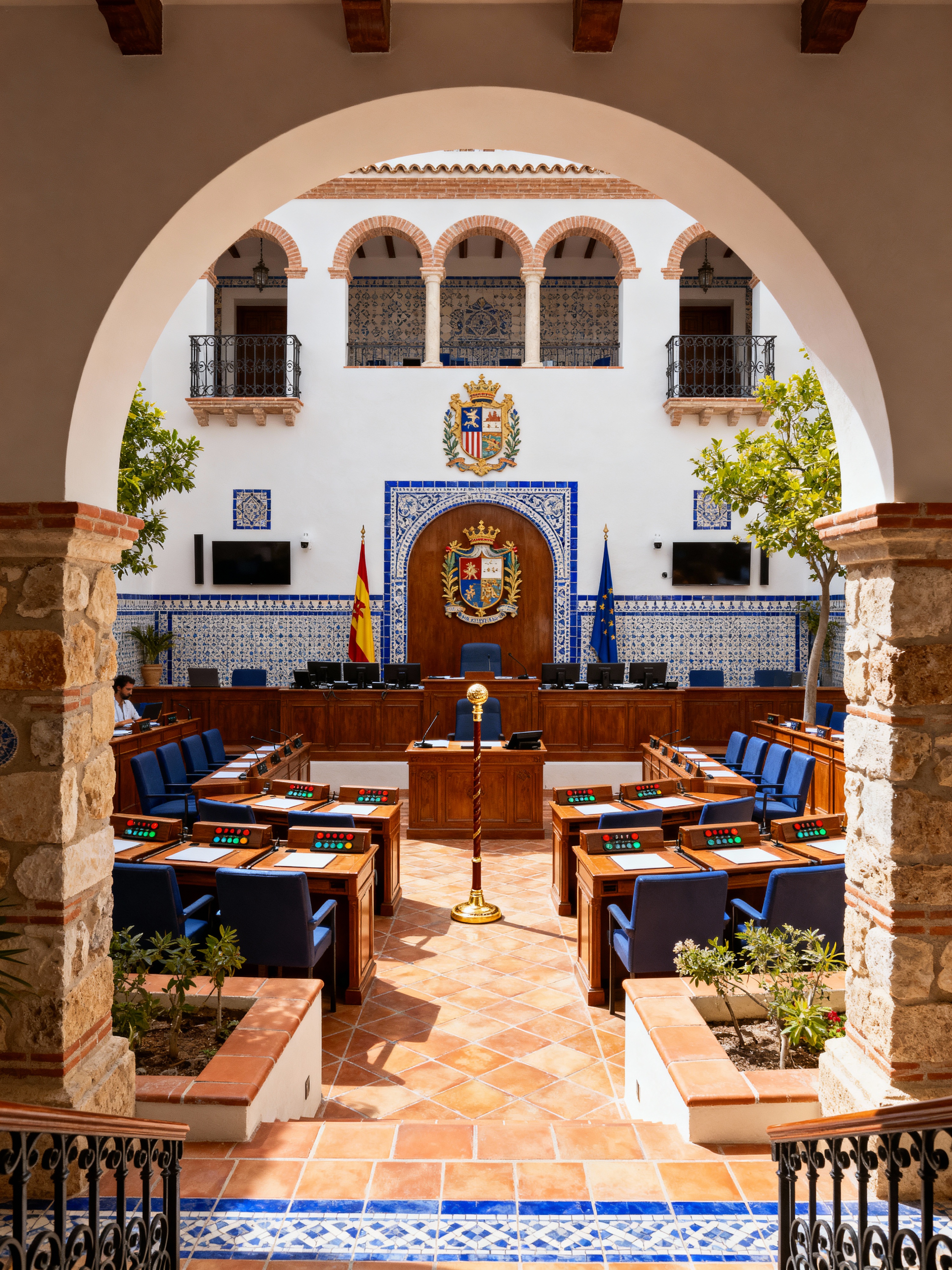 parliament with mediterranean style with ceremonial mace and coat of arms and parliamentary seats and dispatch boxes and voting buttons and gallery seating and hansard reporters and flags. . with mosaic patterns and terracotta tiles and warm earth tones and outdoor living and arched doorways and blue and white and stone accents and wrought iron