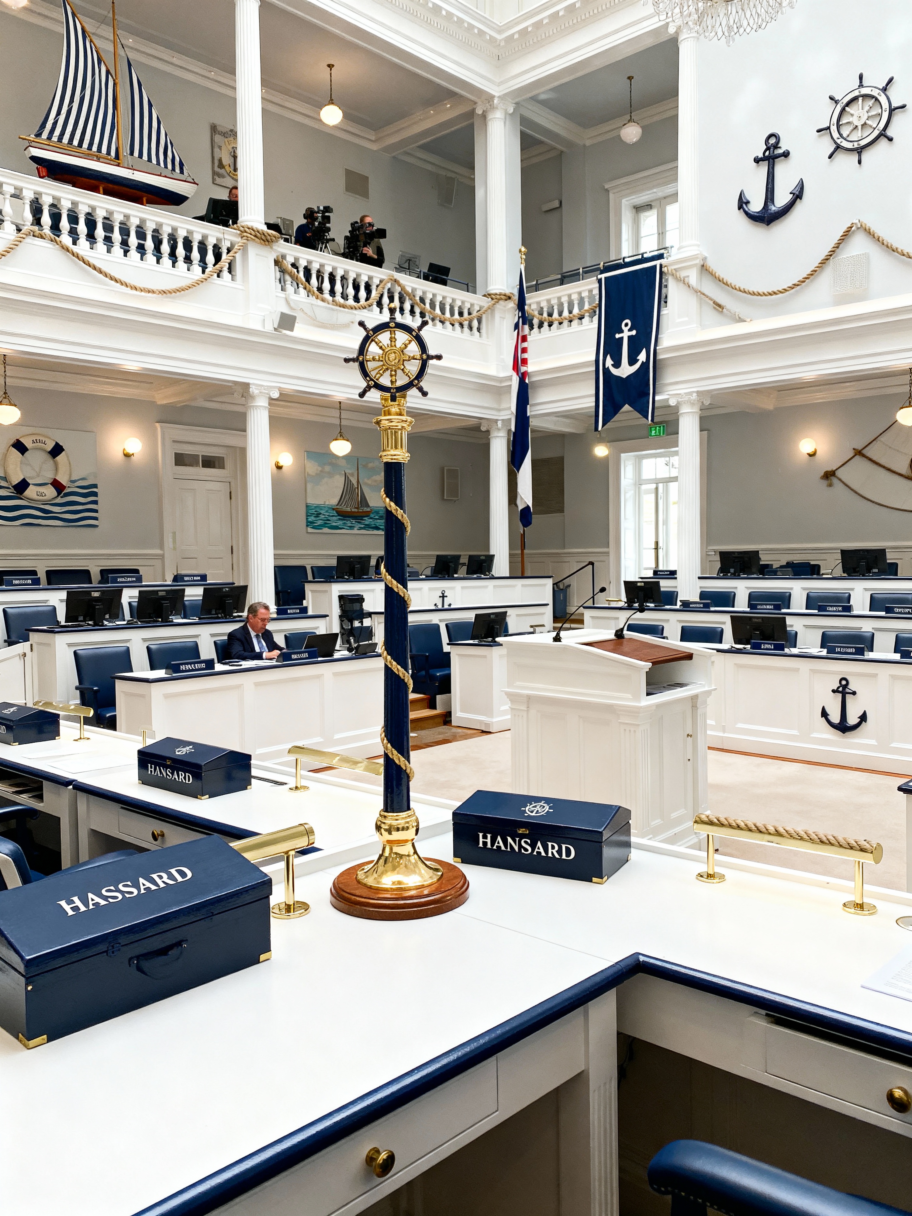 parliament with nautical style with ceremonial mace and gallery seating and dispatch boxes and hansard reporters and parliamentary seats and press gallery and speaker podium and flags. . with crisp white and coastal vibes and maritime decor and sailboat elements and anchor motifs and navy blue and rope details and seaside charm