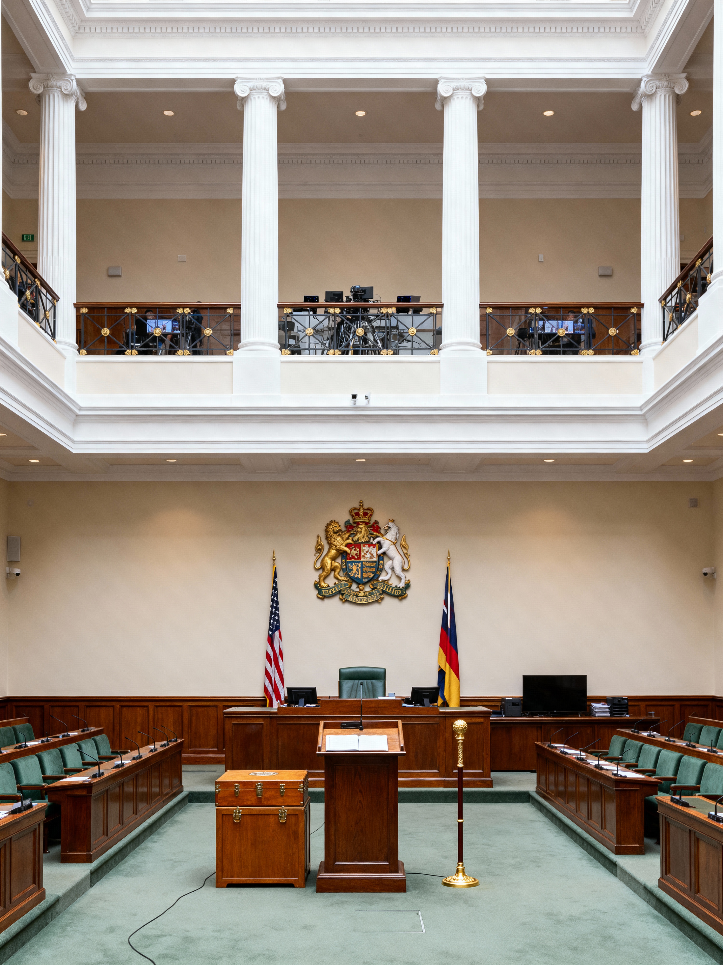 parliament with neoclassic style with press gallery and coat of arms and speaker podium and dispatch boxes and flags and ceremonial mace and parliamentary seats and gallery seating. . with timeless artwork and timeless furniture and thoughtful minimalism and classical architectural details and symmetric layouts and emphasized horizontal and vertical lines and geometric decorative elements and spacious rooms