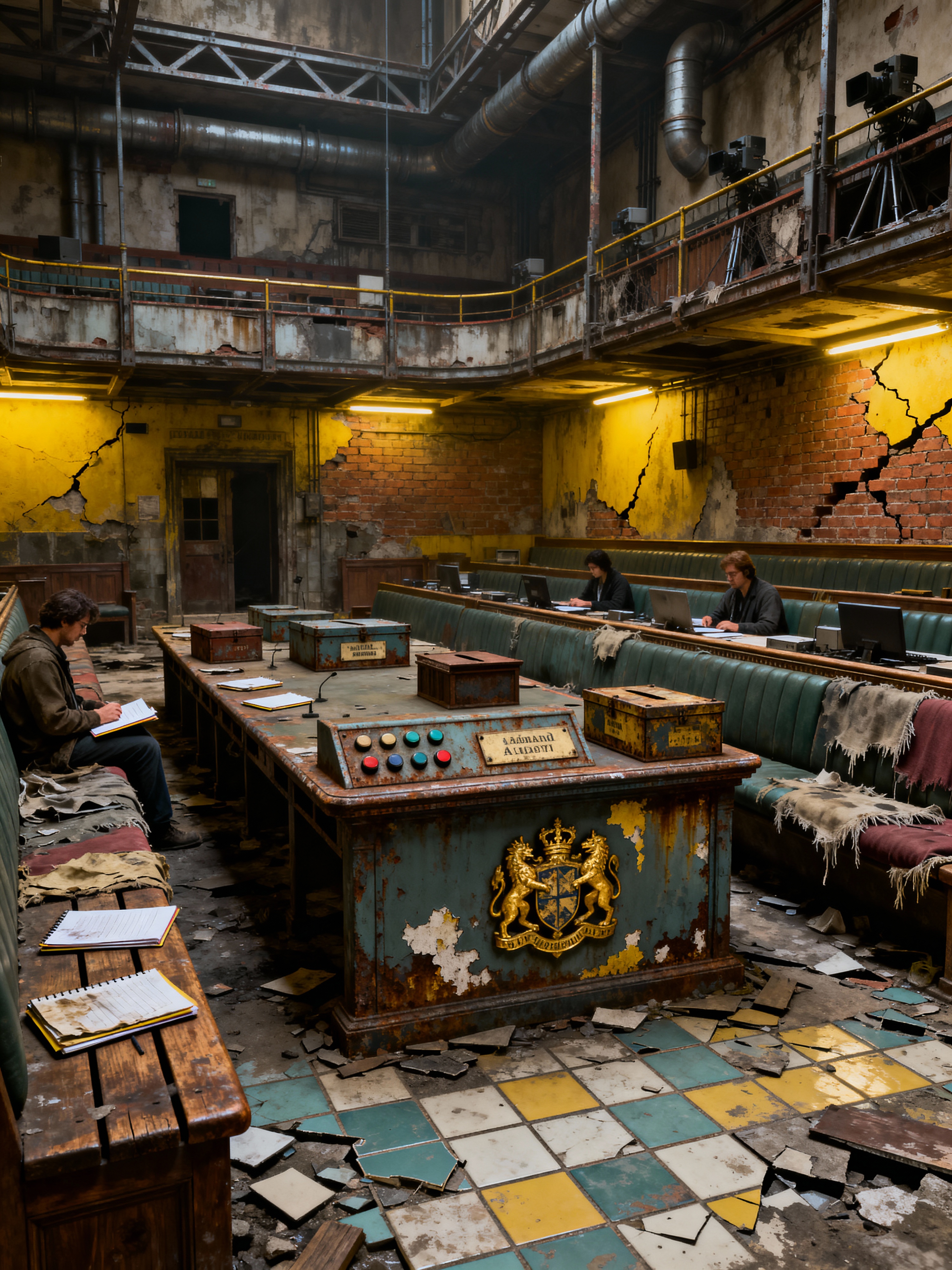 parliament with post-apocalyptic style with gallery seating and press gallery and dispatch boxes and voting buttons and parliamentary seats and speaker podium and coat of arms and hansard reporters. . with dystopian style and poverty-stricken and exposed bricks and neglected atmosphere and weathered materials and dim lighting and industrial elements and broken tiles