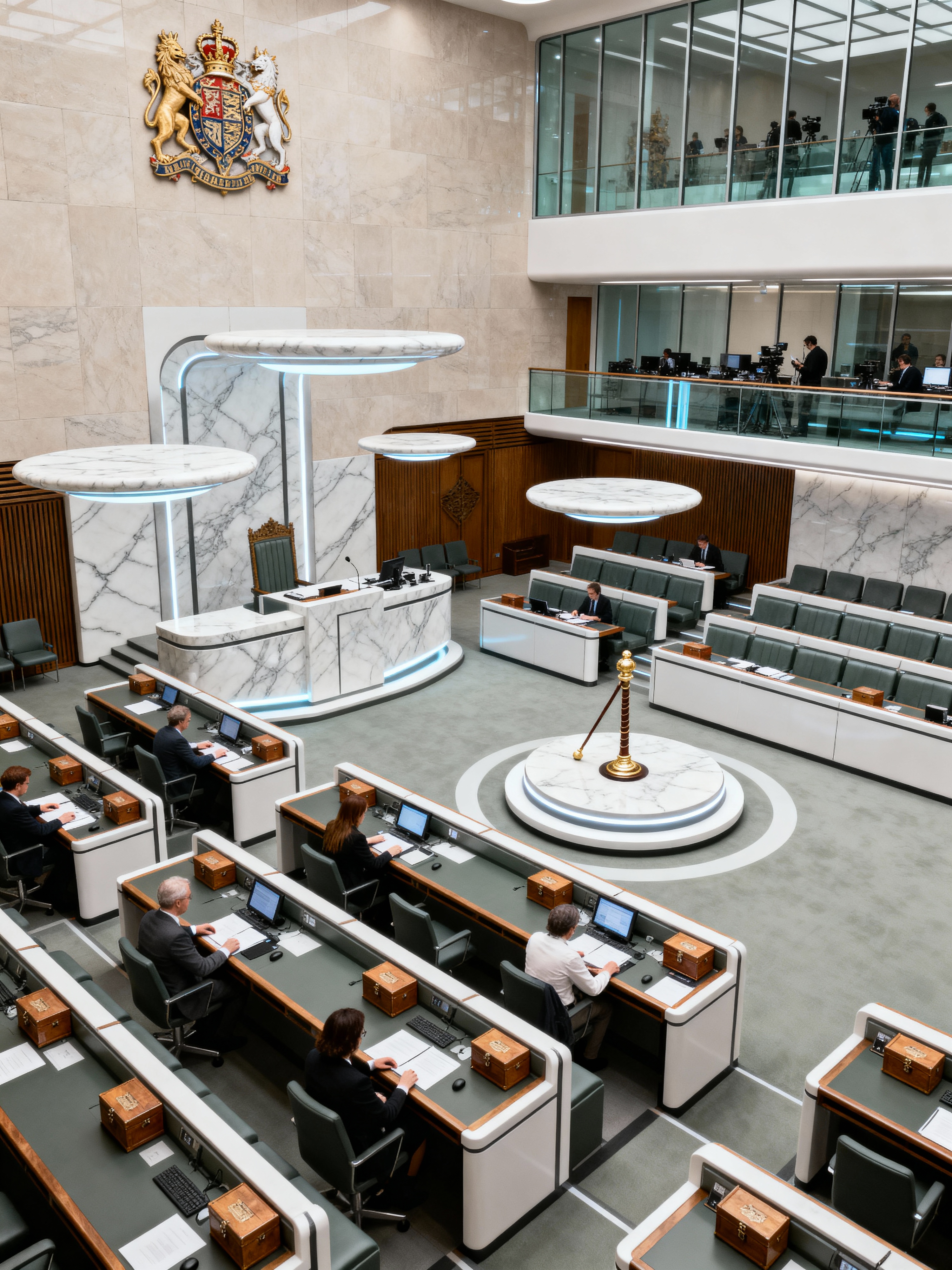 parliament with retro futuristic style with hansard reporters and coat of arms and gallery seating and ceremonial mace and press gallery and dispatch boxes and speaker podium and parliamentary seats. . with minimalist clean lines and monochromatic palette and vintage futurism and floating surfaces and circular shapes and neutral background and bright accents and glass panes and smooth marble