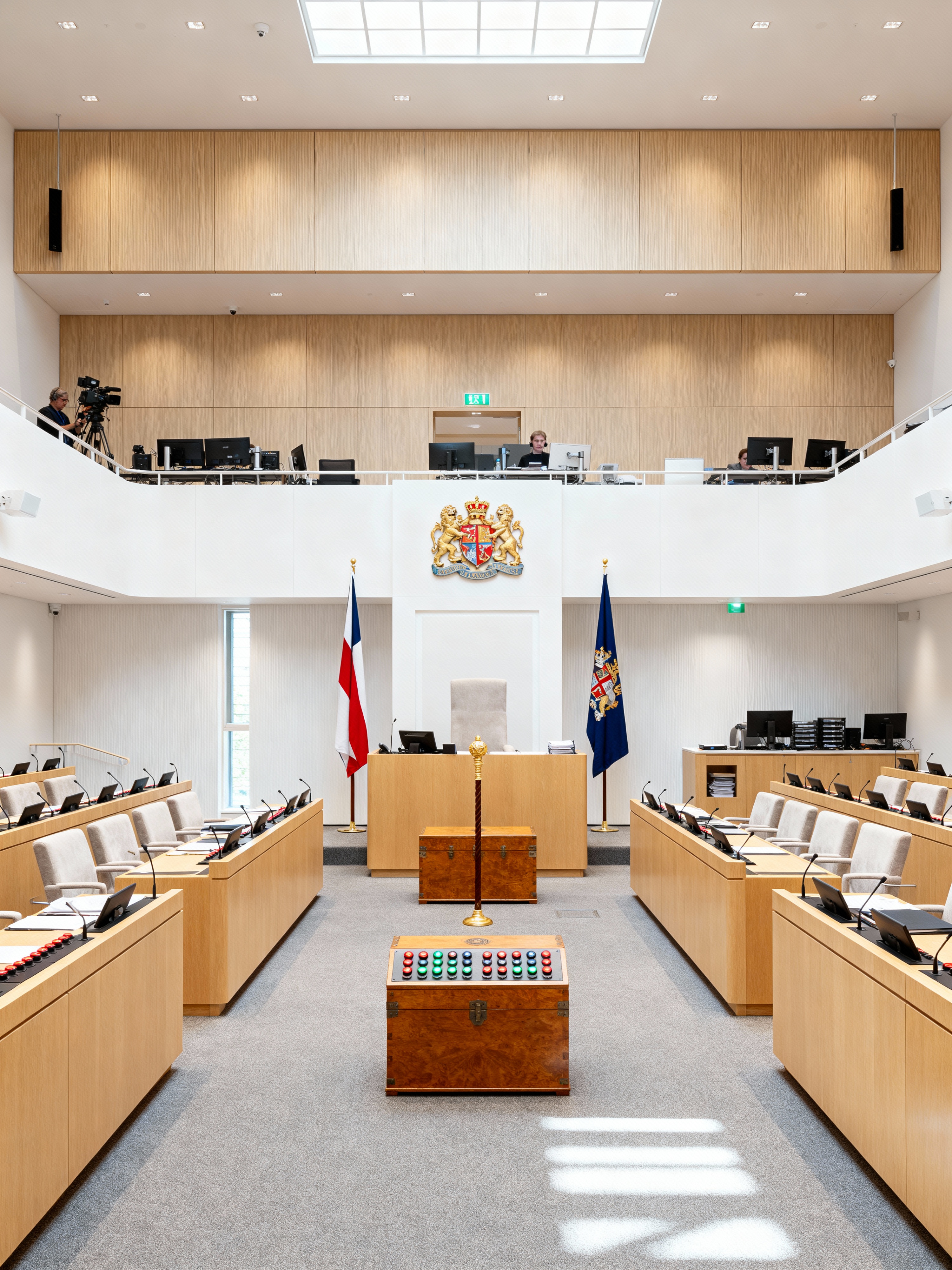 parliament with scandinavian style with voting buttons and flags and hansard reporters and press gallery and ceremonial mace and coat of arms and dispatch boxes and parliamentary seats. . with light wood and white decor and functional furniture and textured fabrics and neutral palette and simple elegance and clean lines and minimalist design
