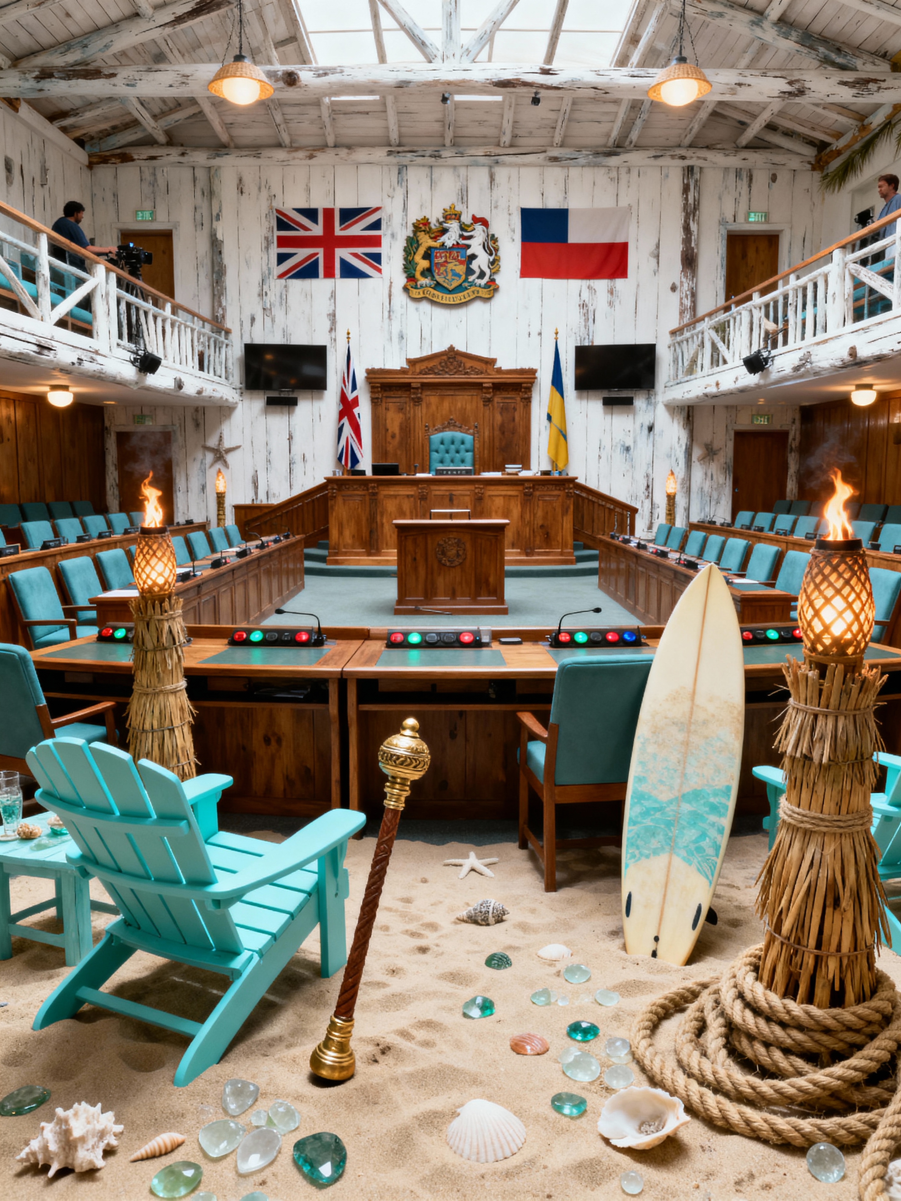 parliament with surf shack style with flags and ceremonial mace and voting buttons and gallery seating and press gallery and speaker podium and parliamentary seats and coat of arms. . with tiki torches and turquoise accents and beach chairs and nautical rope and white-washed walls and sea glass and weathered wood and coastal lighting