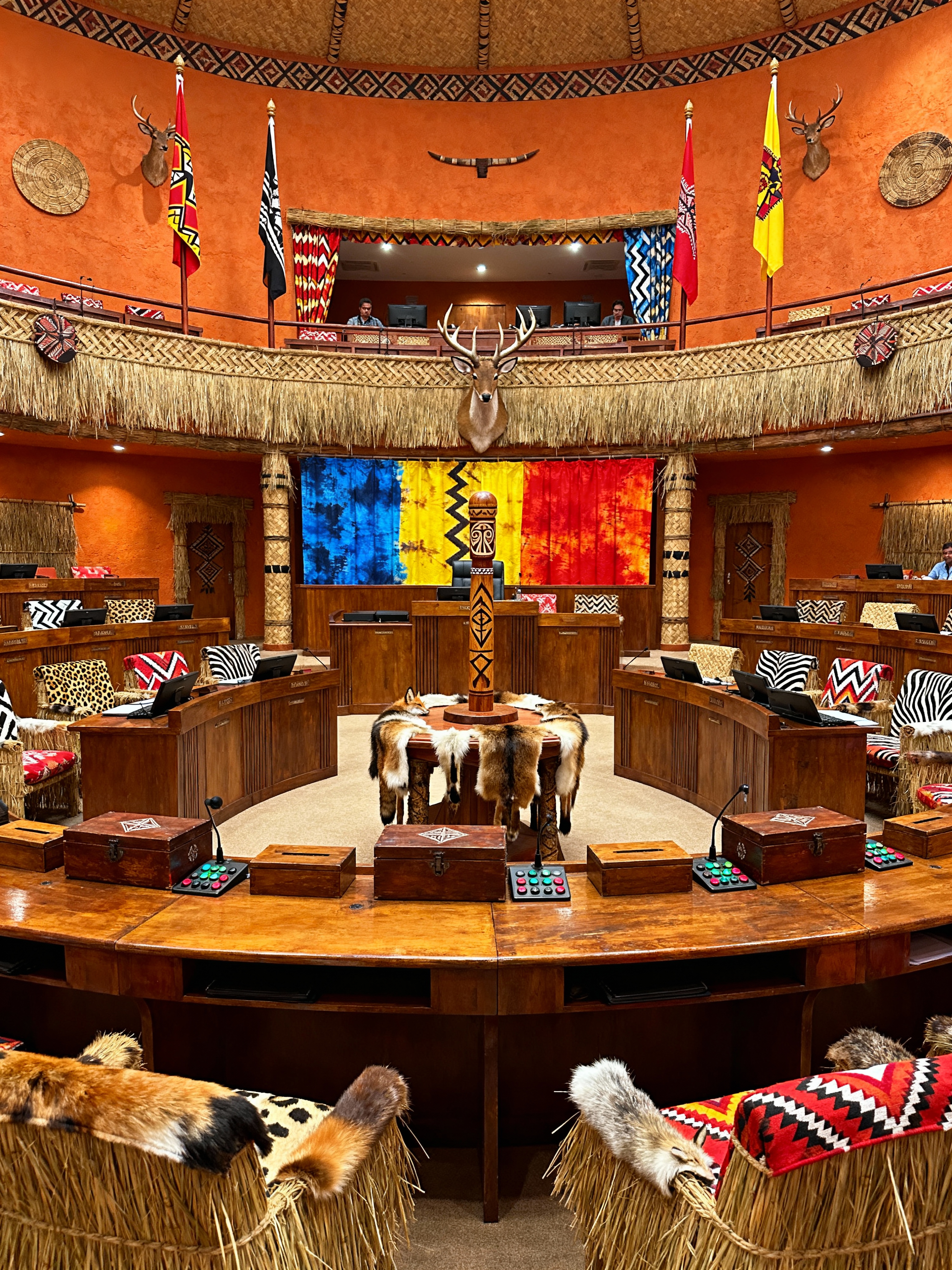 parliament with tribal style with hansard reporters and flags and dispatch boxes and gallery seating and press gallery and voting buttons and ceremonial mace and parliamentary seats. . with intricate grass weaving and exuberant splashes of colour and desert colours and smooth worn timbers and animal prints and tribal patterns and hand dyed batik fabrics and animal furslinen