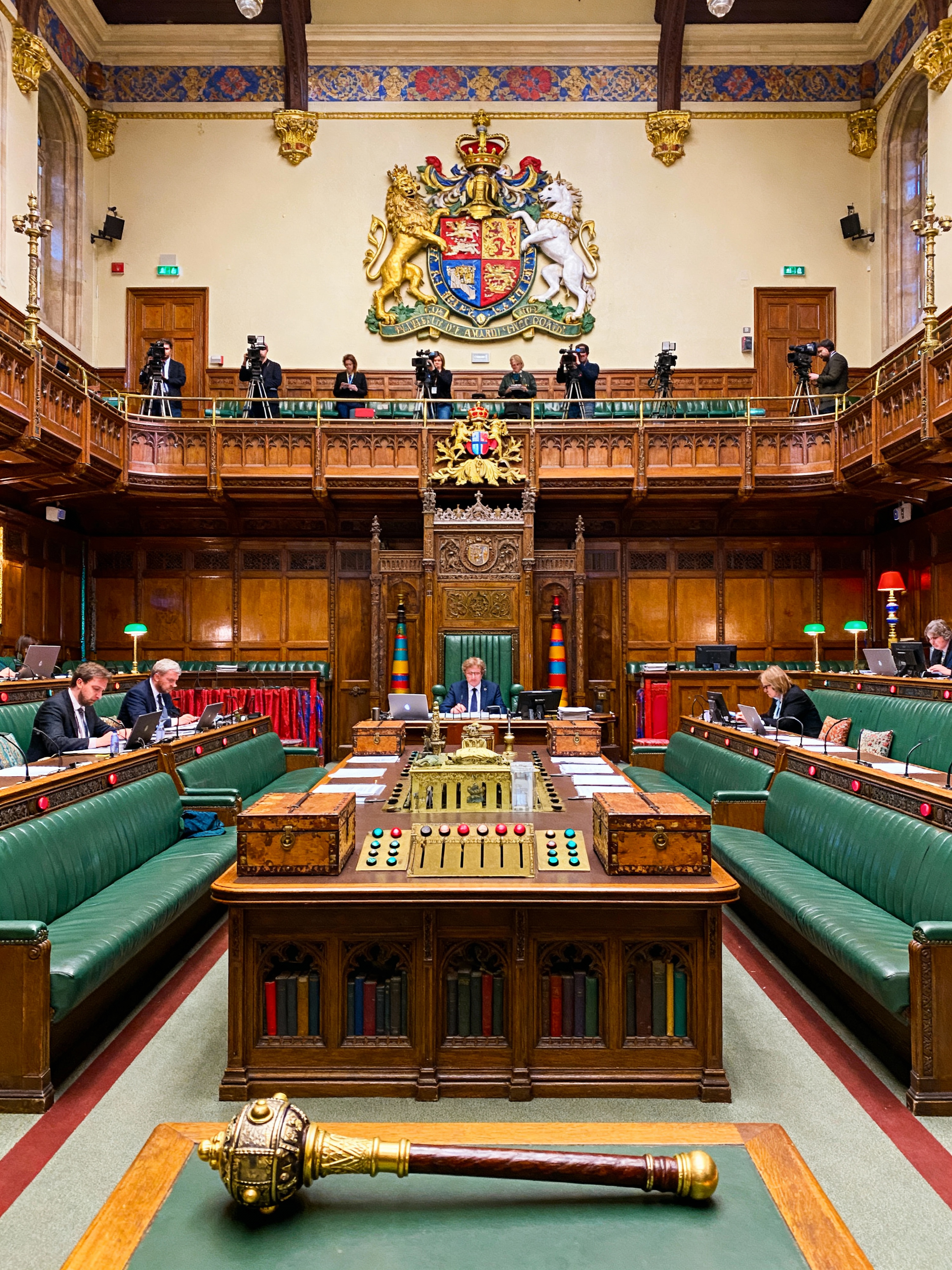 parliament with vintage style with press gallery and coat of arms and hansard reporters and voting buttons and dispatch boxes and ceremonial mace and gallery seating and speaker podium. . with ornate details and upcycled furniture and eclectic and antique decor and colorful accents and timeless pieces and nostalgic feel and bold patterns