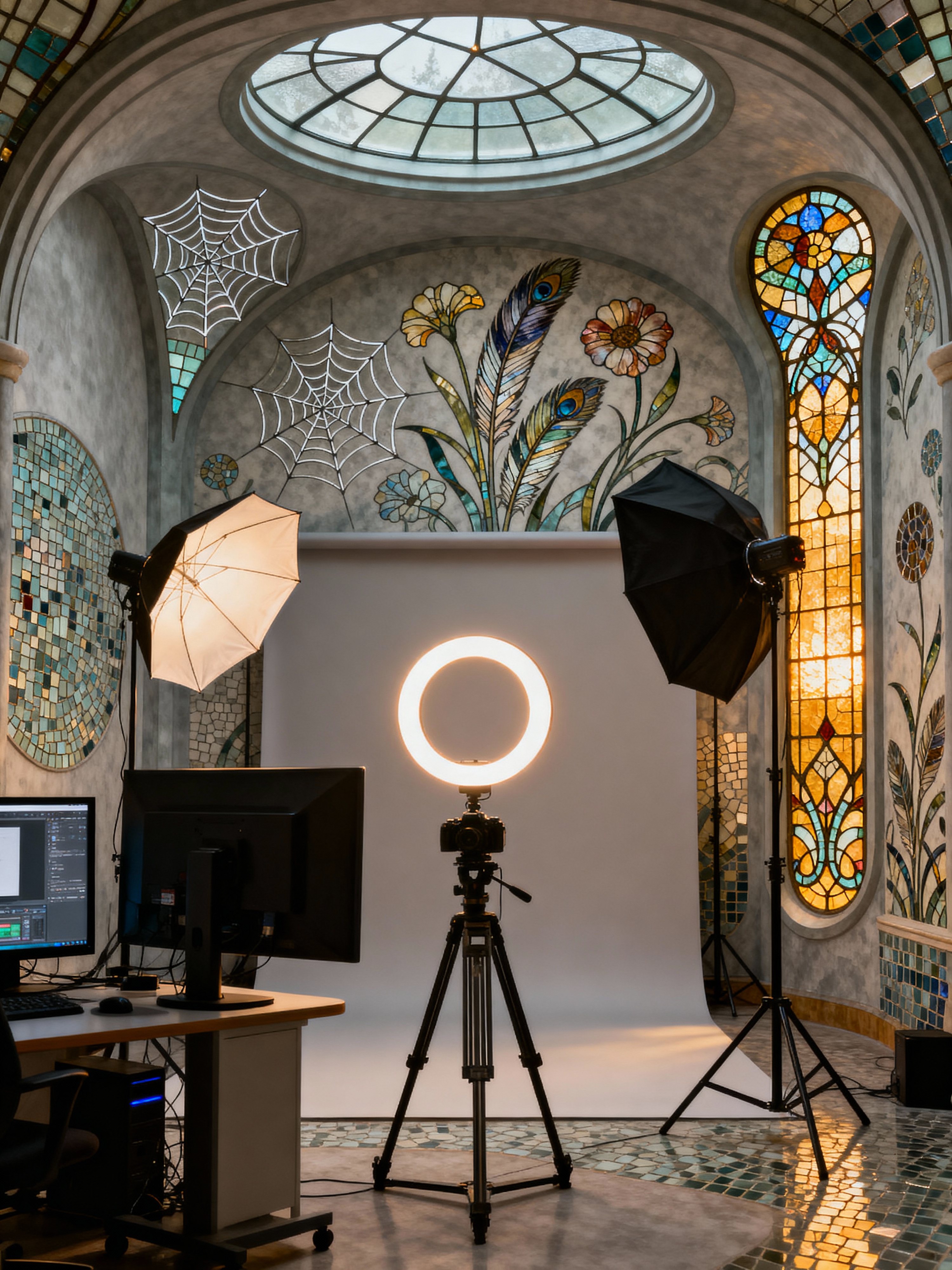 photography studio with art nouveau style with professional photography studio and studio monitor and photo studio interior and photography umbrella lights and photography studio and camera on tripod and ring light and photography studio. . with wallpaper pattners of spider webs and ashy colors and curved glass and wallpaper patterns of stylized flowers and mosaics and soft, rounded lines and stained glass and wallpaper patterns of feathers