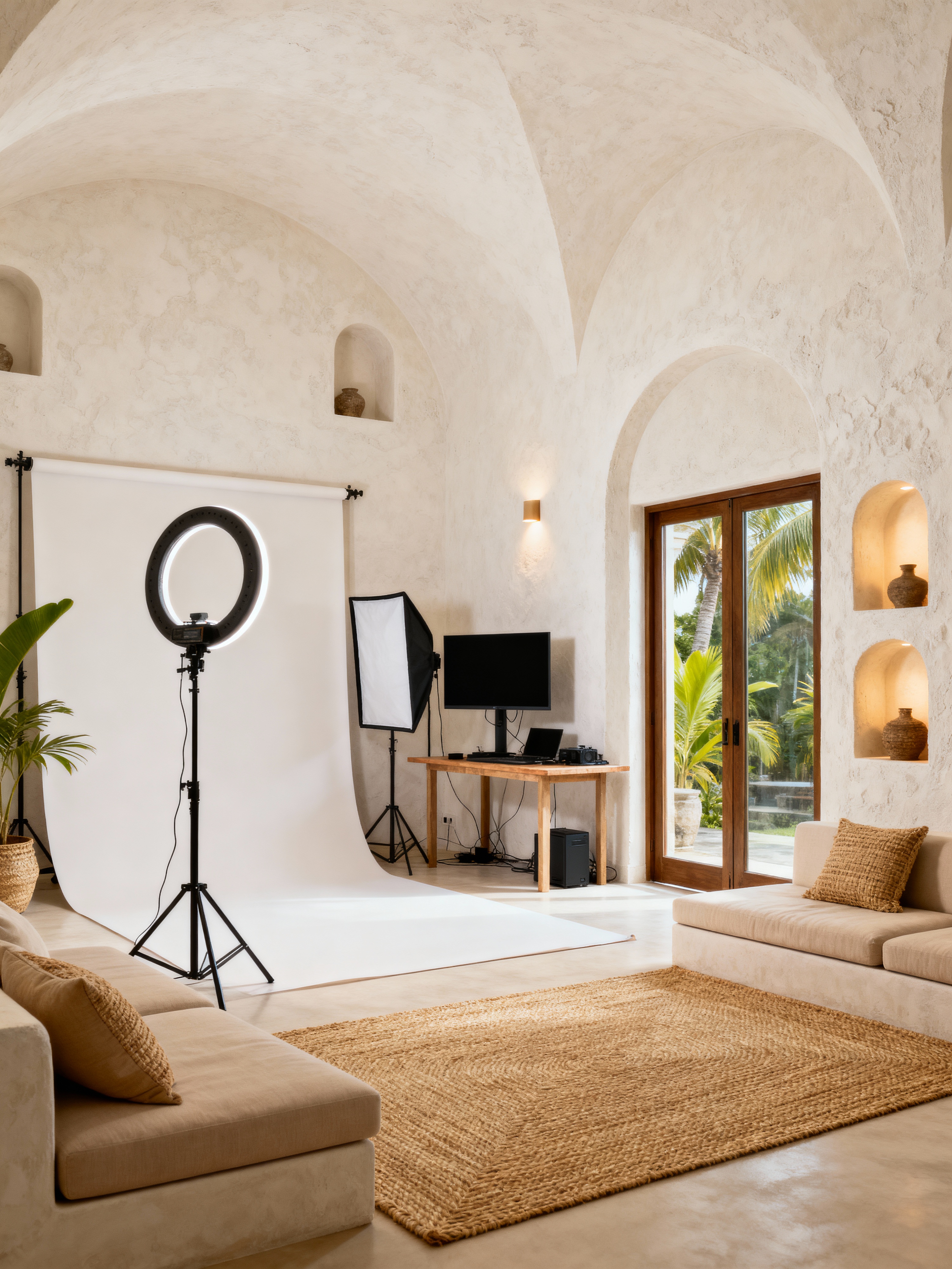 photography studio with bali style with ring light and photography backdrop and photography studio and photo studio interior and studio monitor and soft lighting and reflector panels and equipment table. . with calm, minimal, tropical atmosphere and woven rugs (jute, seagrass) and textured plaster or stucco finish and white or cream walls and beige and sand tone cushions and low modular sofas and arched walls and niches and indoor-outdoor flow with glass doors