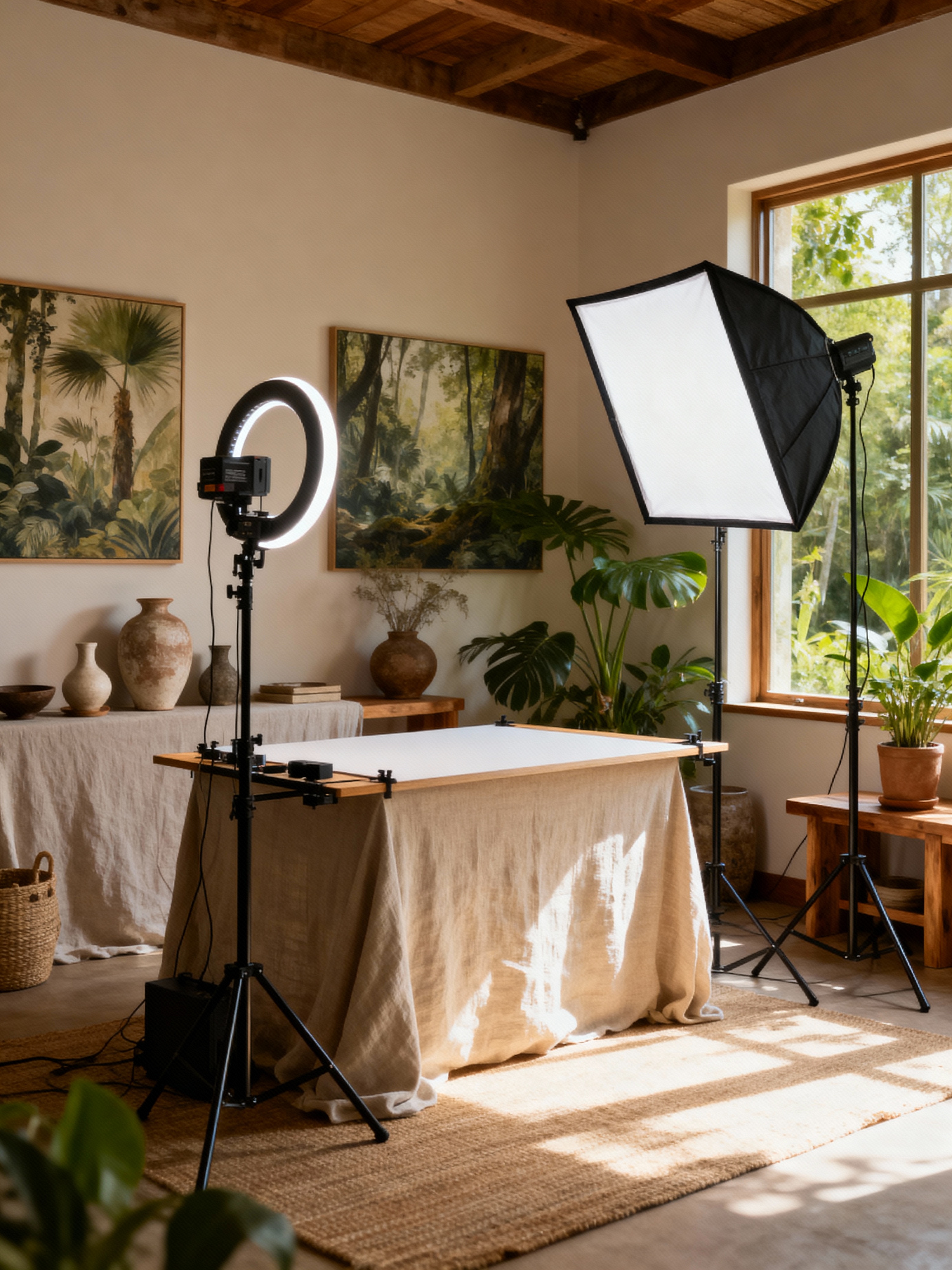 photography studio with biophilic style with equipment table and professional photography studio and ring light and photography studio and photography umbrella lights and photo shoot studio and professional photography studio and reflector panels. . with linen materials and images of nature and sunlight and features of nature and ceramic materials and plants and wood materials and environmental features