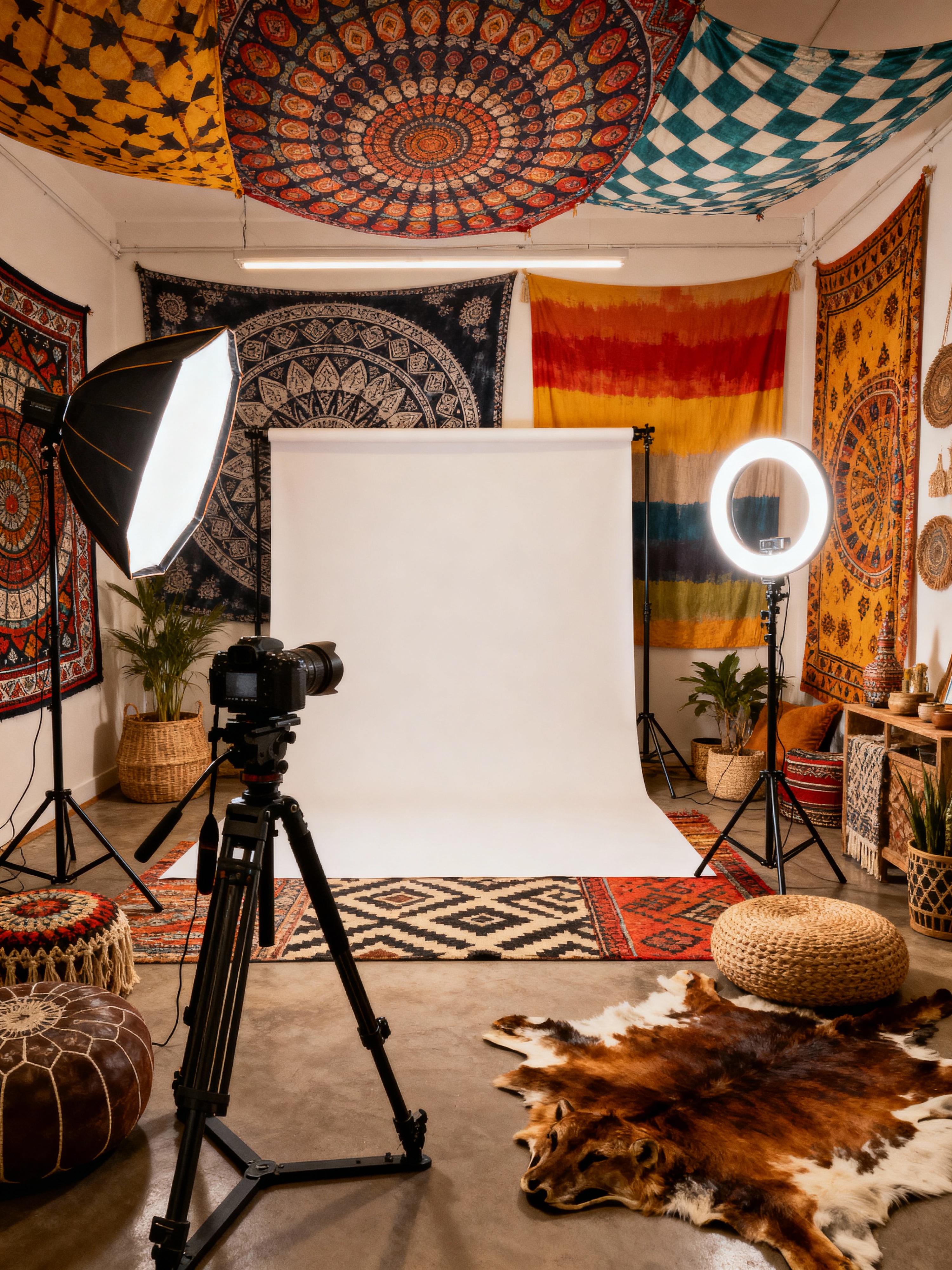 photography studio with bohemian style with photography umbrella lights and photography studio and professional photography studio and softbox lights and soft lighting and camera on tripod and ring light and reflector panels. . with bold patterns and playful patterns and mixed patterns and bold colors and playful textures and carefree layers of pattern, texture, and color and natural materials and animal hides