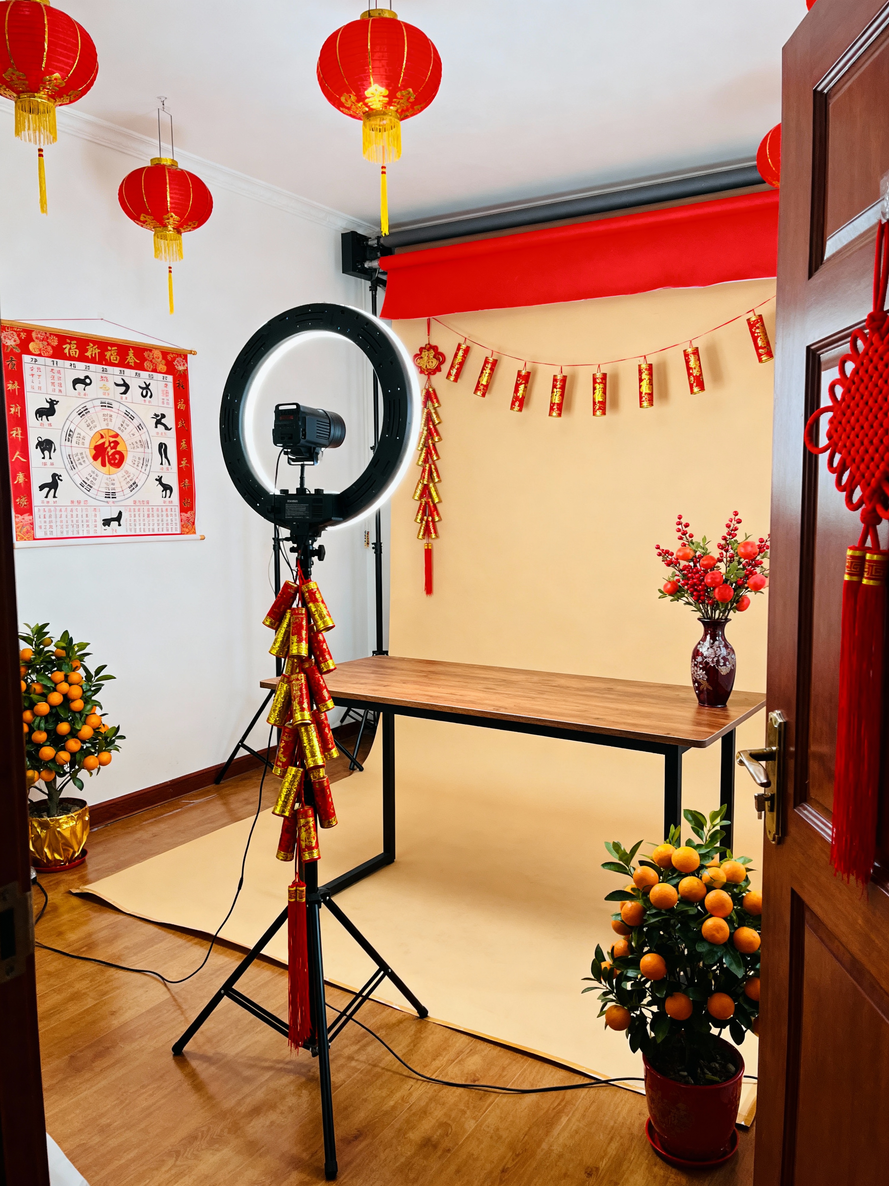 photography studio with chinese new year style with photography studio and photography backdrop and photography studio and ring light and photography studio and photo studio interior and equipment table and professional photography studio. . with chinese red lanterns and zodiac calendar and paper firecrackers and orange trees and red and gold tassels and kumquat trees and mei hwa flowers and chinese knots