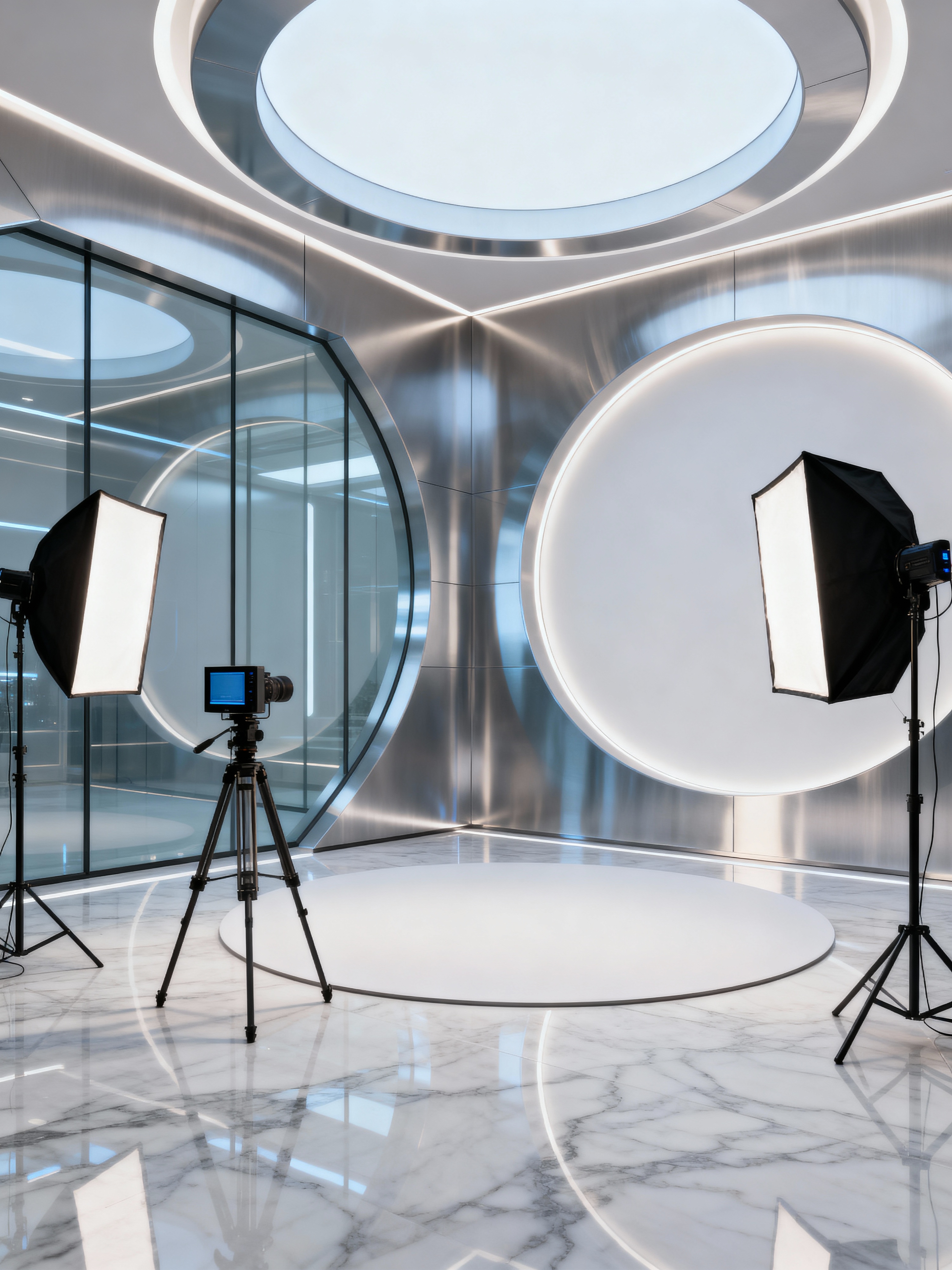 photography studio with futuristic style with soft lighting and reflector panels and photography studio and studio monitor and photo studio interior and softbox lights and professional photography studio and camera on tripod. . with futurism and steel finishing and strong geometric walls and glass panes and futuristic interior and smooth polished marble and light colors and circular shapes