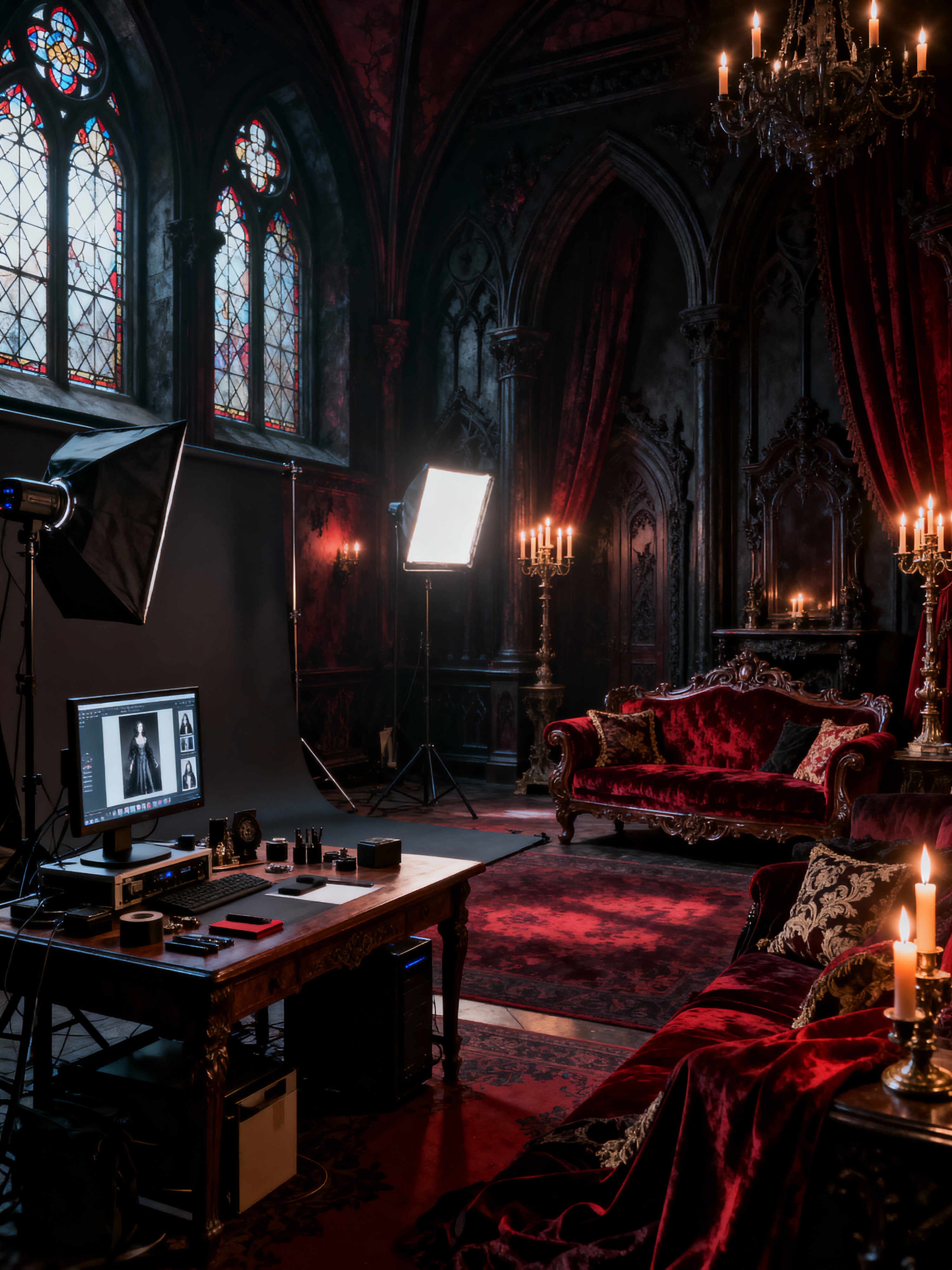 photography studio with gothic style with professional photography studio and photography studio and photo studio interior and equipment table and studio monitor and professional lighting equipment and soft lighting and softbox lights. . with dark colors and dramatic atmosphere and ornate details and heavy furniture and arched windows and medieval influence and rich fabrics and candlelit ambiance