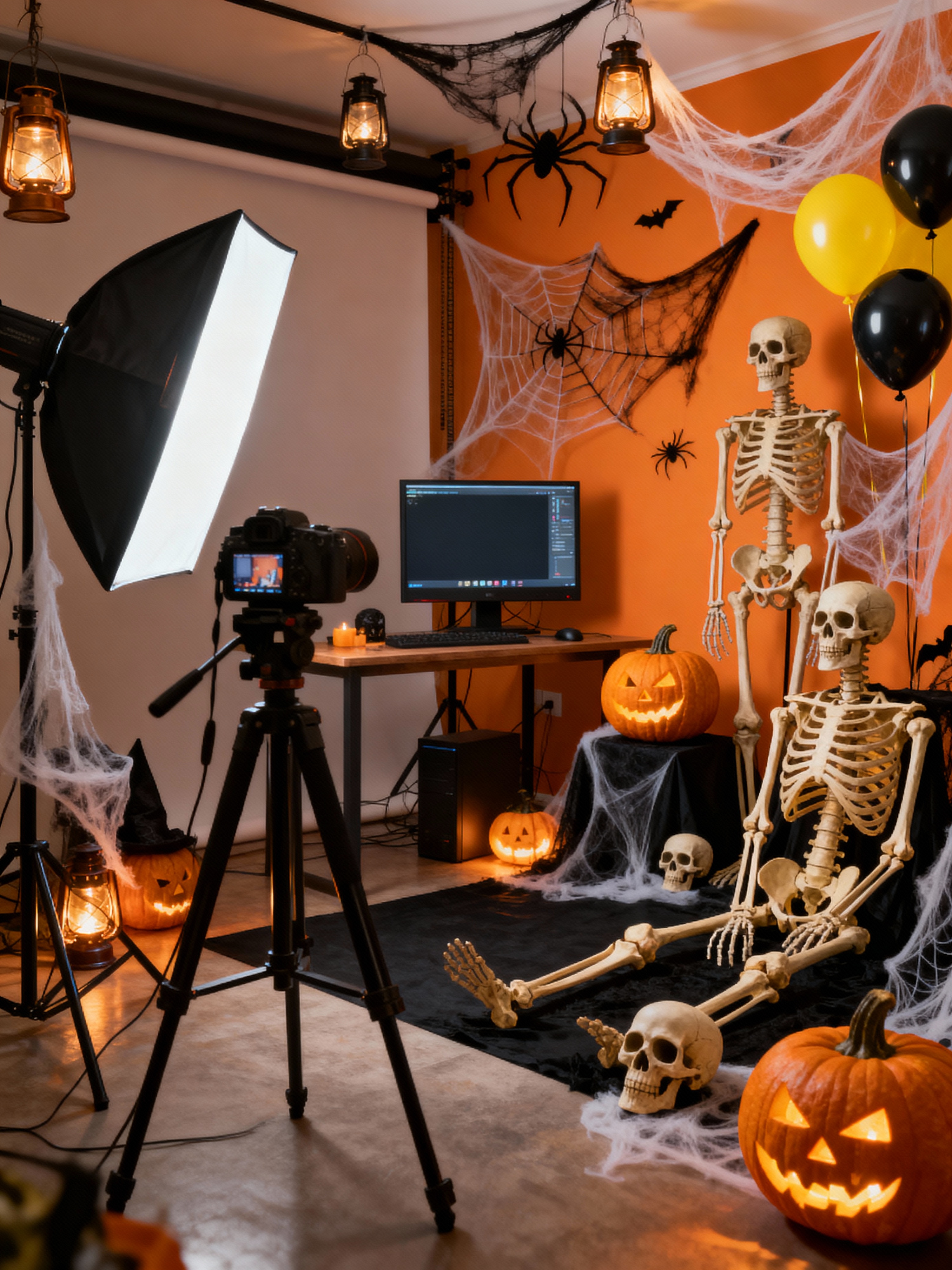 photography studio with halloween style with professional photography studio and photo studio interior and camera on tripod and soft lighting and photography studio and studio monitor and photography studio and professional lighting equipment. . with lanterns and spiderwebs and lanterns and skeletons sitting and standing and glowing pumpkins and cobwebs and human skulls and yellow black balloons