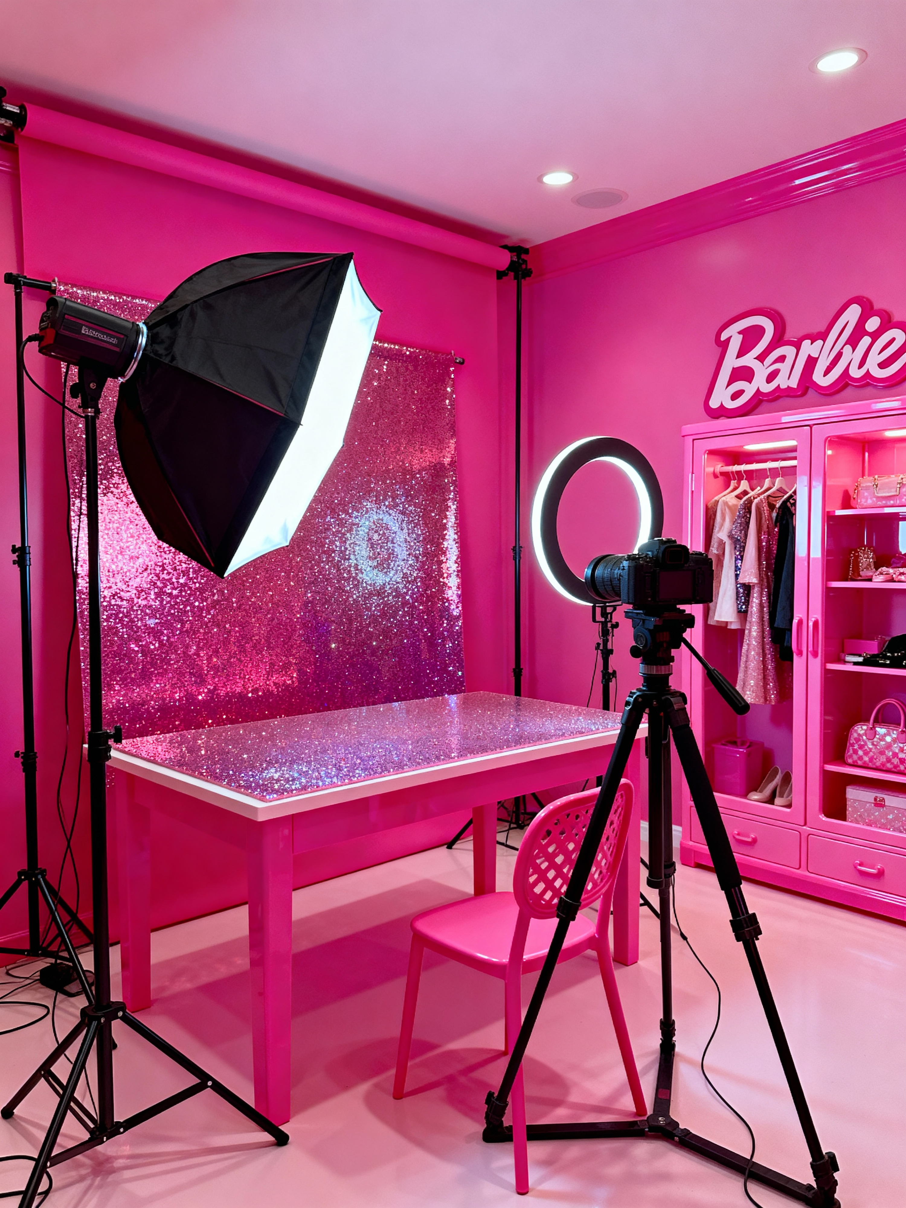 photography studio with hot pink style with equipment table and photo studio interior and photography studio and photography umbrella lights and reflector panels and ring light and camera on tripod and professional lighting equipment. . with barbie closet and barbie plastic interior and hot pink barbie walls and barbie bold rosy hues like fuchsia and magenta and hot pink barbie colors and barbie style interior and barbie glitter and sparkle and barbie chairs