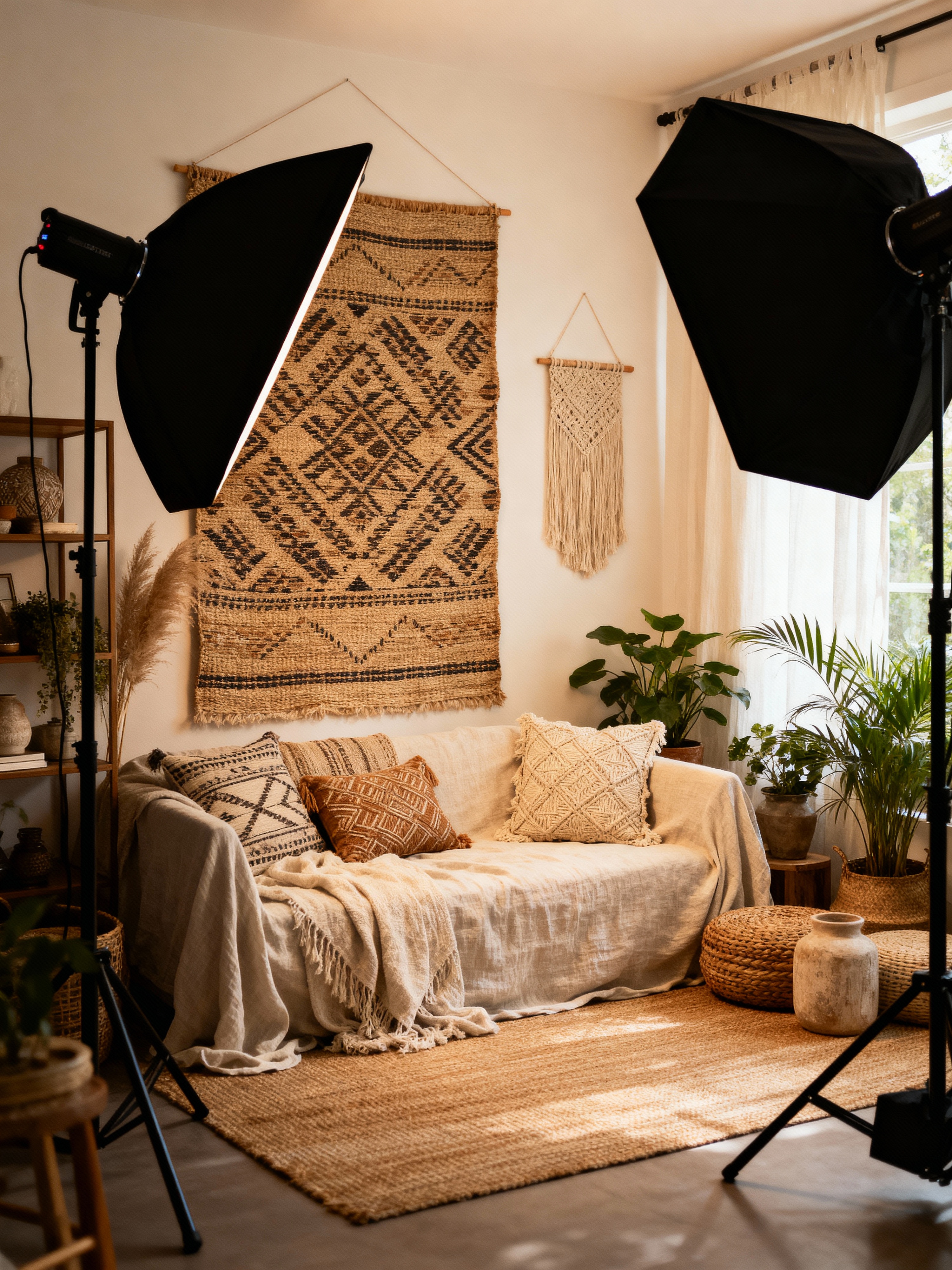 photography studio with modern boho style with photo studio interior and softbox lights and reflector panels and professional photography studio and photo studio interior and photography studio and photo studio interior and soft lighting. . with cotton textiles and eclectic style and cozy feel and collected look and woven textures and linen fabric and expressive decor and greenery