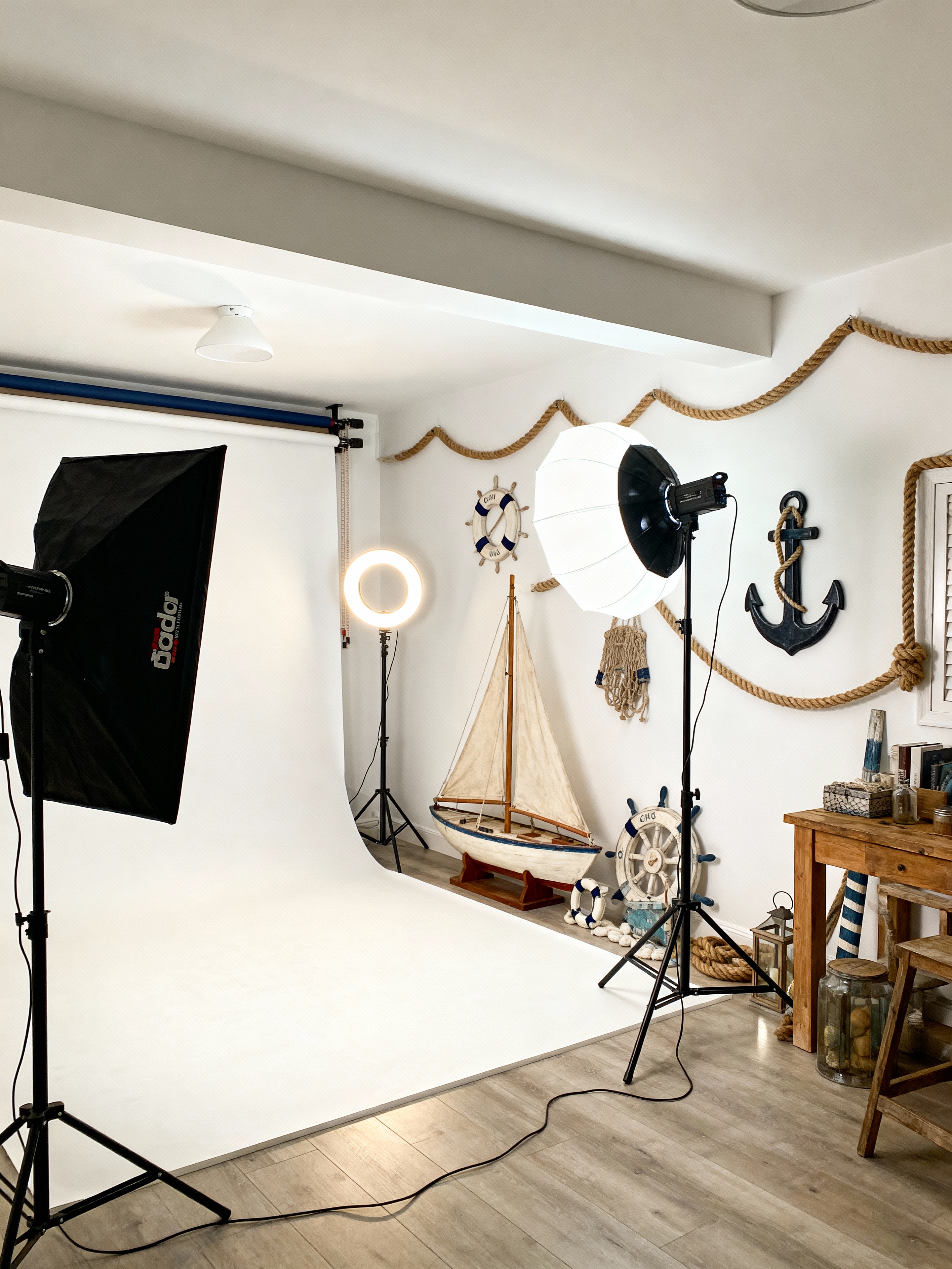 photography studio with nautical style with reflector panels and soft lighting and photography studio and photography backdrop and ring light and photography umbrella lights and photography studio and photo studio interior. . with coastal vibes and anchor motifs and maritime decor and ocean inspiration and crisp white and rope details and seaside charm and sailboat elements