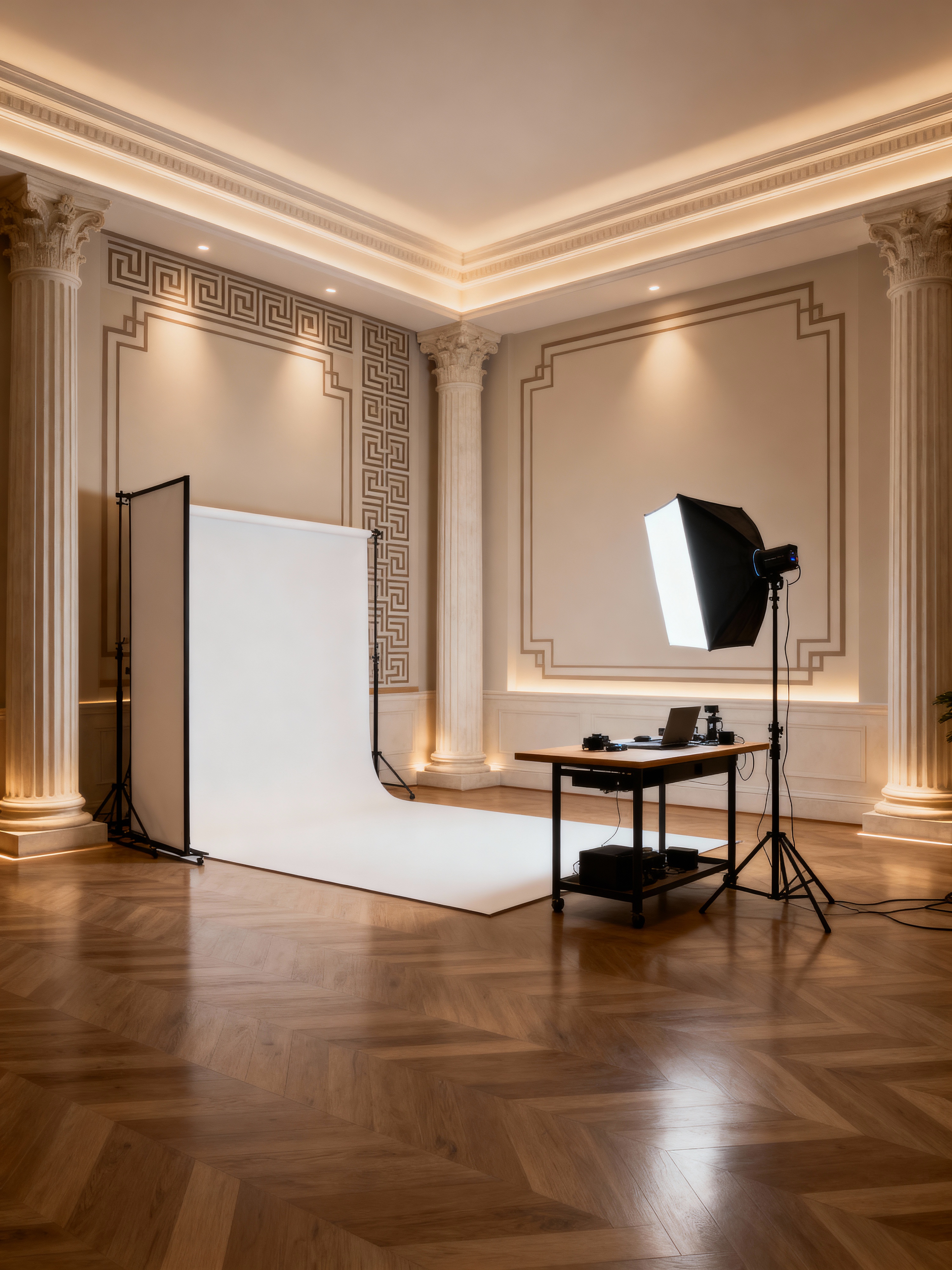 photography studio with neoclassic style with soft lighting and photography studio and reflector panels and professional photography studio and equipment table and professional photography studio and photo studio interior and photo shoot studio. . with thoughtful minimalism and greek columns and emphasized horizontal and vertical lines and classical architectural details and geometric decorative elements and symmetric layouts and spacious rooms and timeless furniture