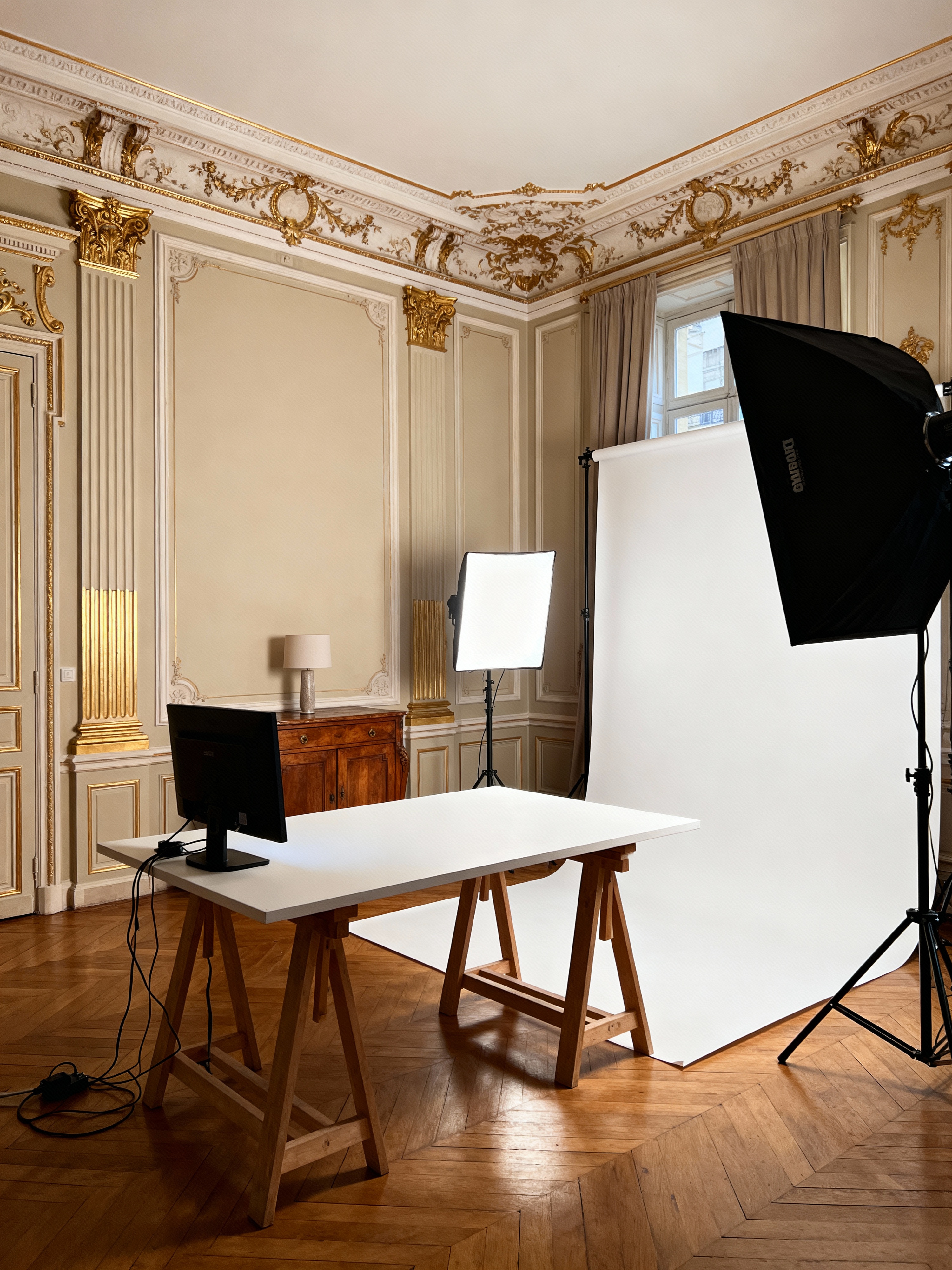 photography studio with parisian style with equipment table and soft lighting and softbox lights and studio monitor and photo shoot studio and photography studio and photo studio interior and photography backdrop. . with chic simplicity and classic details and ornate moldings and vintage pieces and sophisticated charm and neutral palette and refined style and timeless beauty