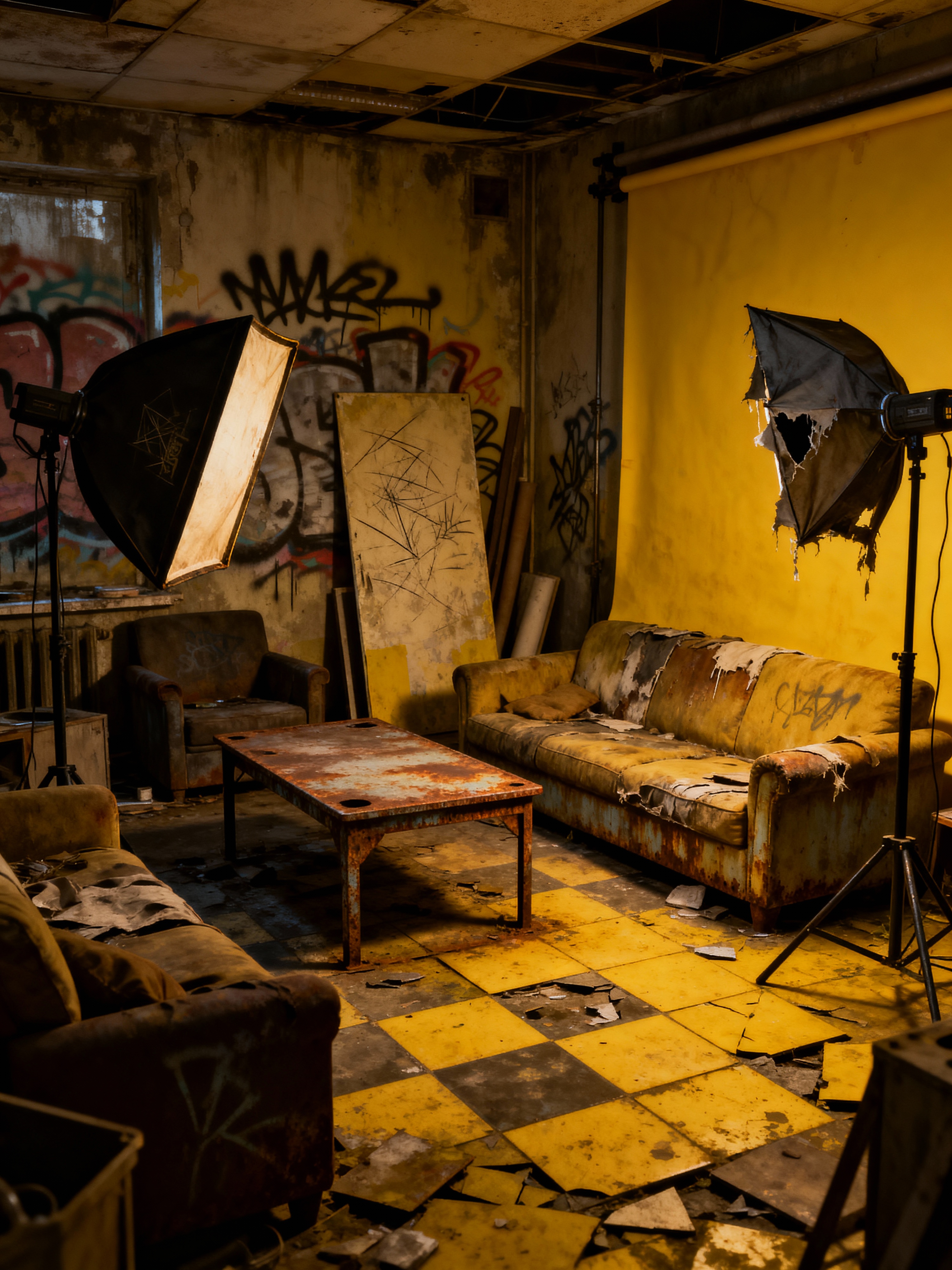 photography studio with post-apocalyptic style with photo studio interior and photography studio and professional photography studio and reflector panels and photography studio and photography umbrella and photography backdrop and photo studio interior. . with cheap mismatched furniture and post-apocalyptic and poverty-stricken and graffiti on walls and worn textures and dim lighting and abandoned look and broken tiles