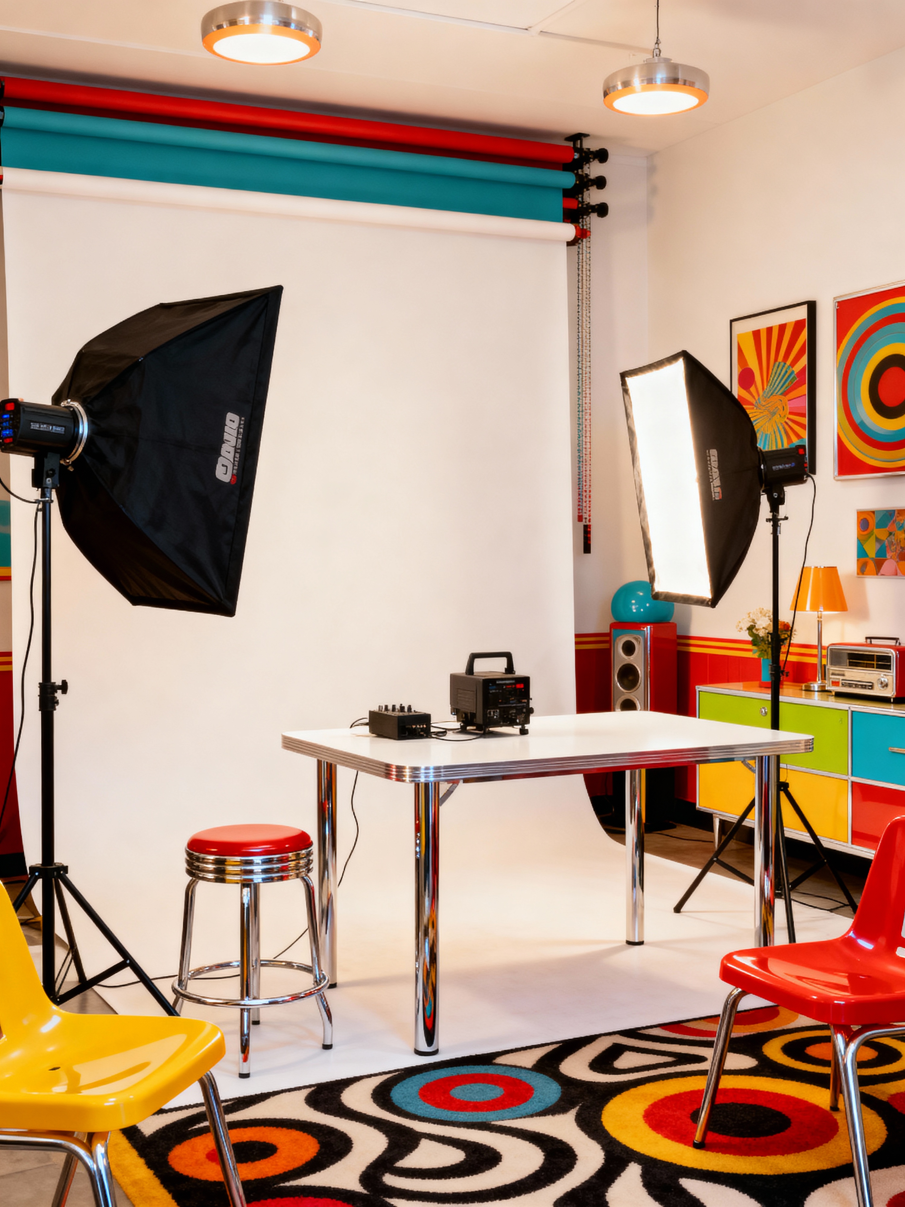 photography studio with retro style with reflector panels and equipment table and professional photography studio and professional photography studio and photography umbrella lights and photo shoot studio and softbox lights and photo studio interior. . with nostalgic pieces and funky decor and vintage revival and chrome accents and plastic furniture and bold patterns and groovy vibes and bright colors