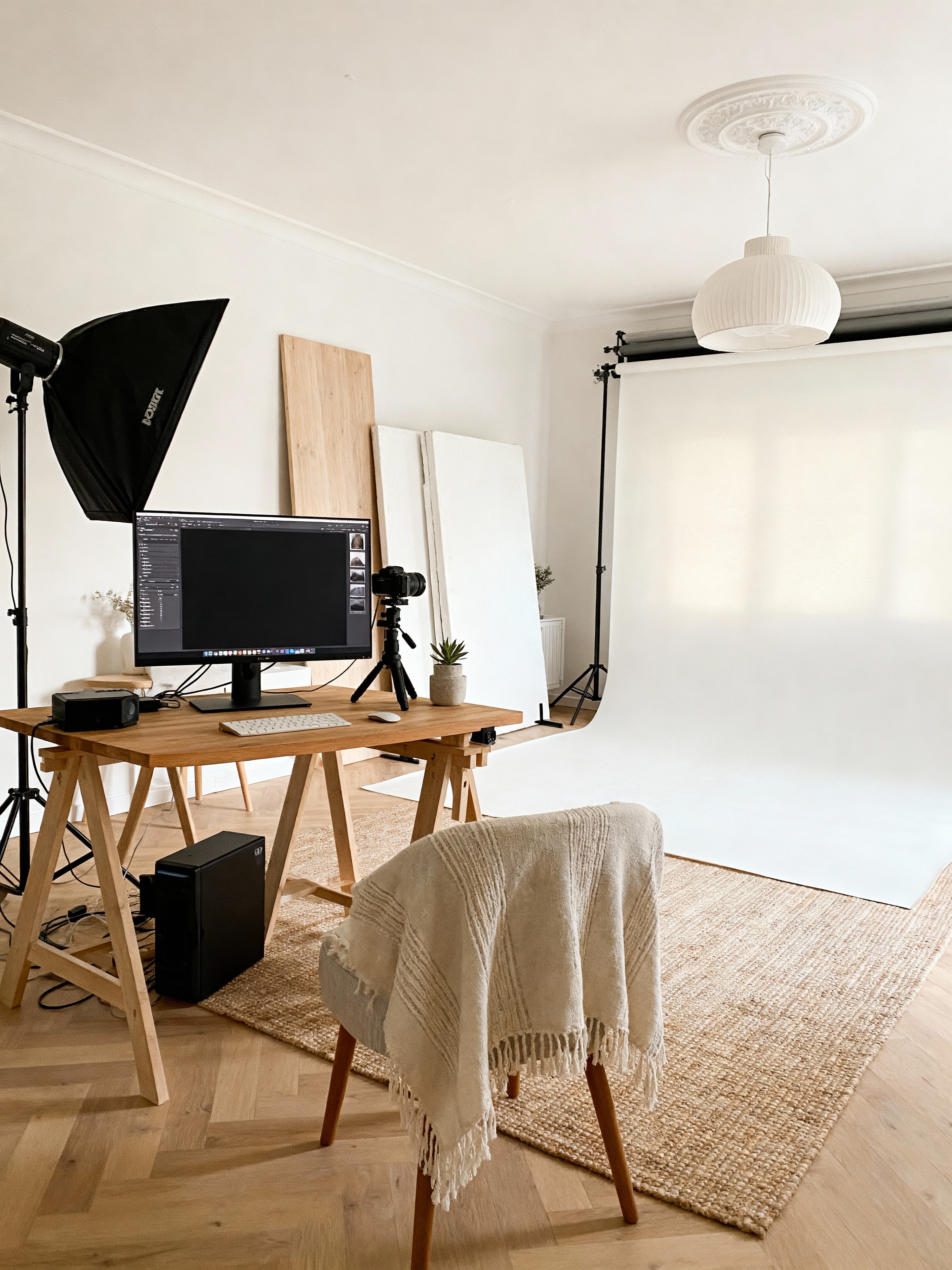 photography studio with scandinavian style with equipment table and professional photography studio and studio monitor and photography studio and photography backdrop and reflector panels and softbox lights and soft lighting. . with functional furniture and clean lines and white decor and simple elegance and textured fabrics and natural light and light wood and minimalist design