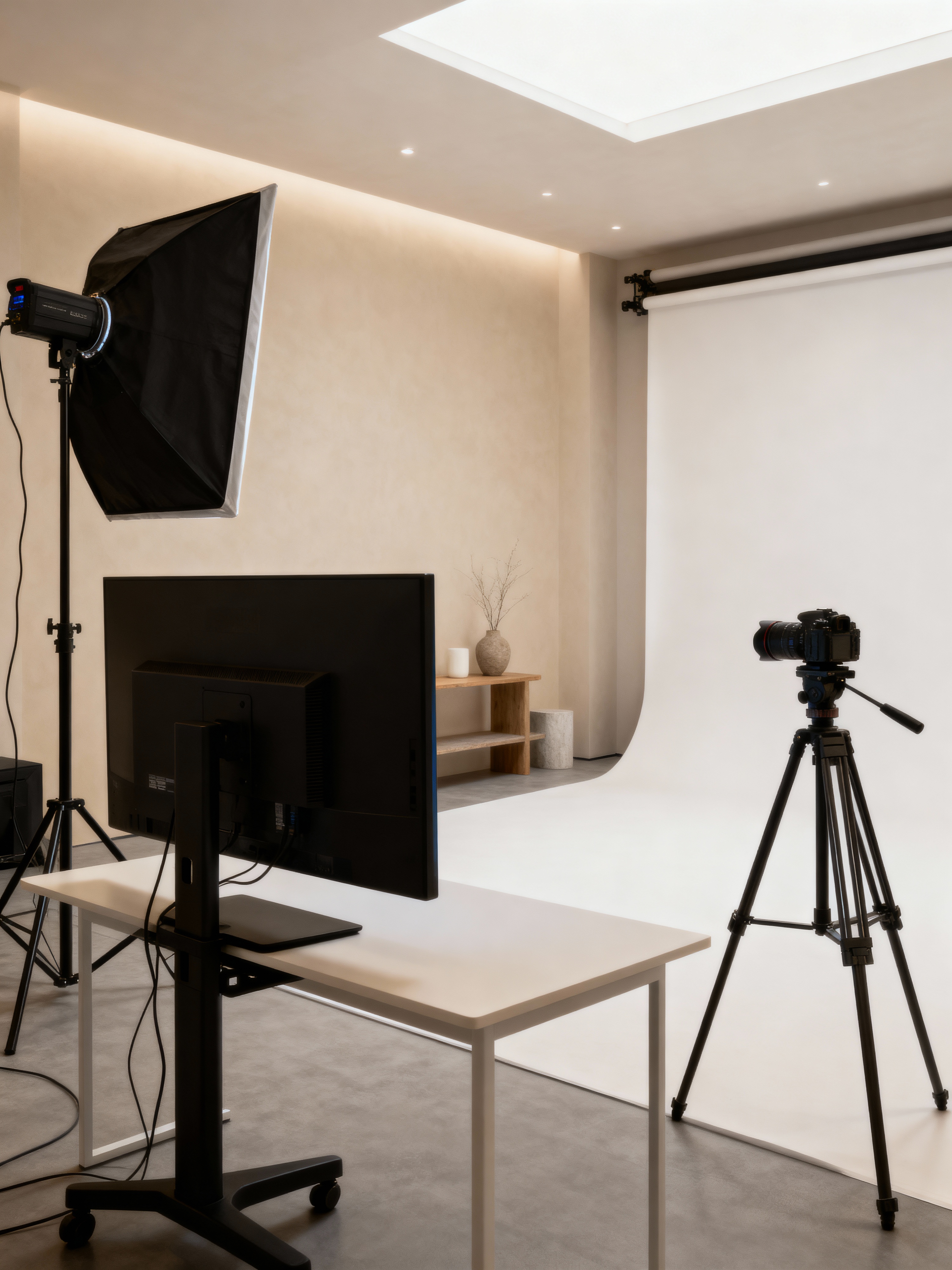 photography studio with simple style with photo shoot studio and studio monitor and professional photography studio and professional photography studio and professional lighting equipment and camera on tripod and photography studio and photo studio interior. . with calm atmosphere and pure simplicity and basic elements and minimal decor and uncluttered space and streamlined look and neutral colors and clean design
