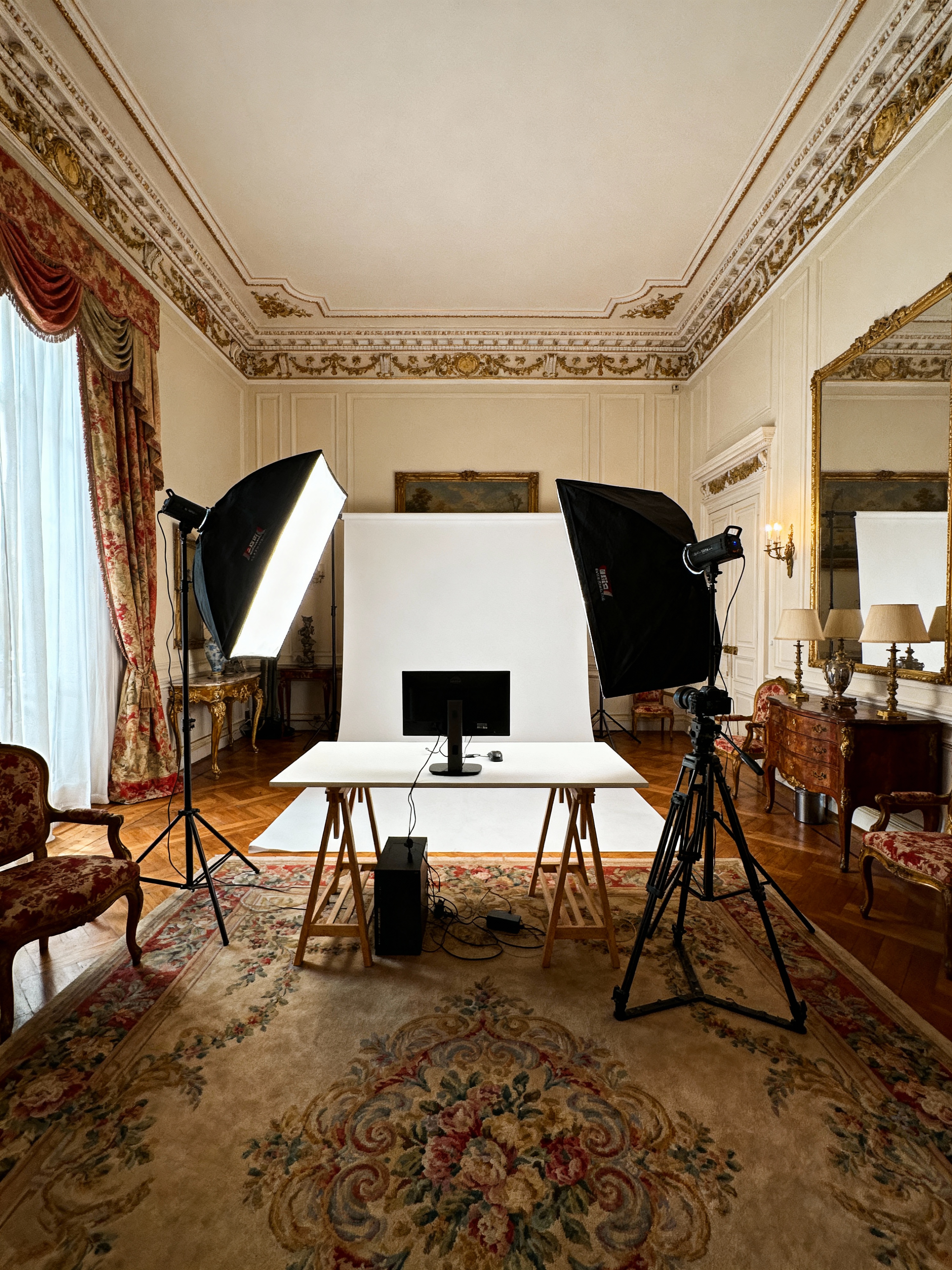 photography studio with traditional style with photo shoot studio and equipment table and professional lighting equipment and studio monitor and photography studio and reflector panels and photography studio and camera on tripod. . with timeless design and symmetrical layout and antique pieces and crown molding and formal furniture and refined atmosphere and rich fabrics and luxurious textiles
