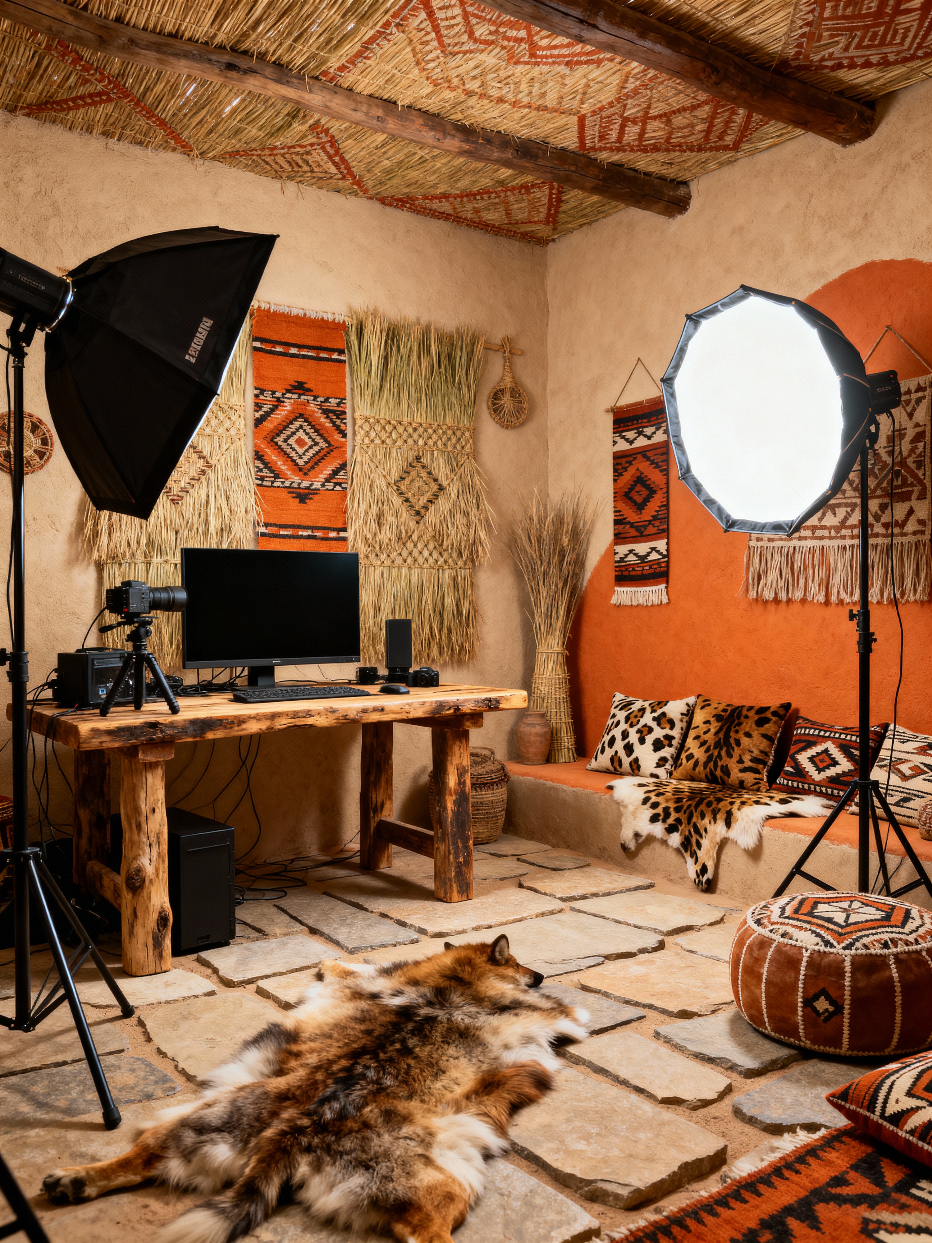 photography studio with tribal style with equipment table and photography umbrella lights and professional photography studio and reflector panels and studio monitor and photography studio and photo studio interior and photography studio. . with animal furslinen and intricate grass weaving and planks of stone and smooth worn timbers and desert colours and tribal revival and animal prints and tribal patterns