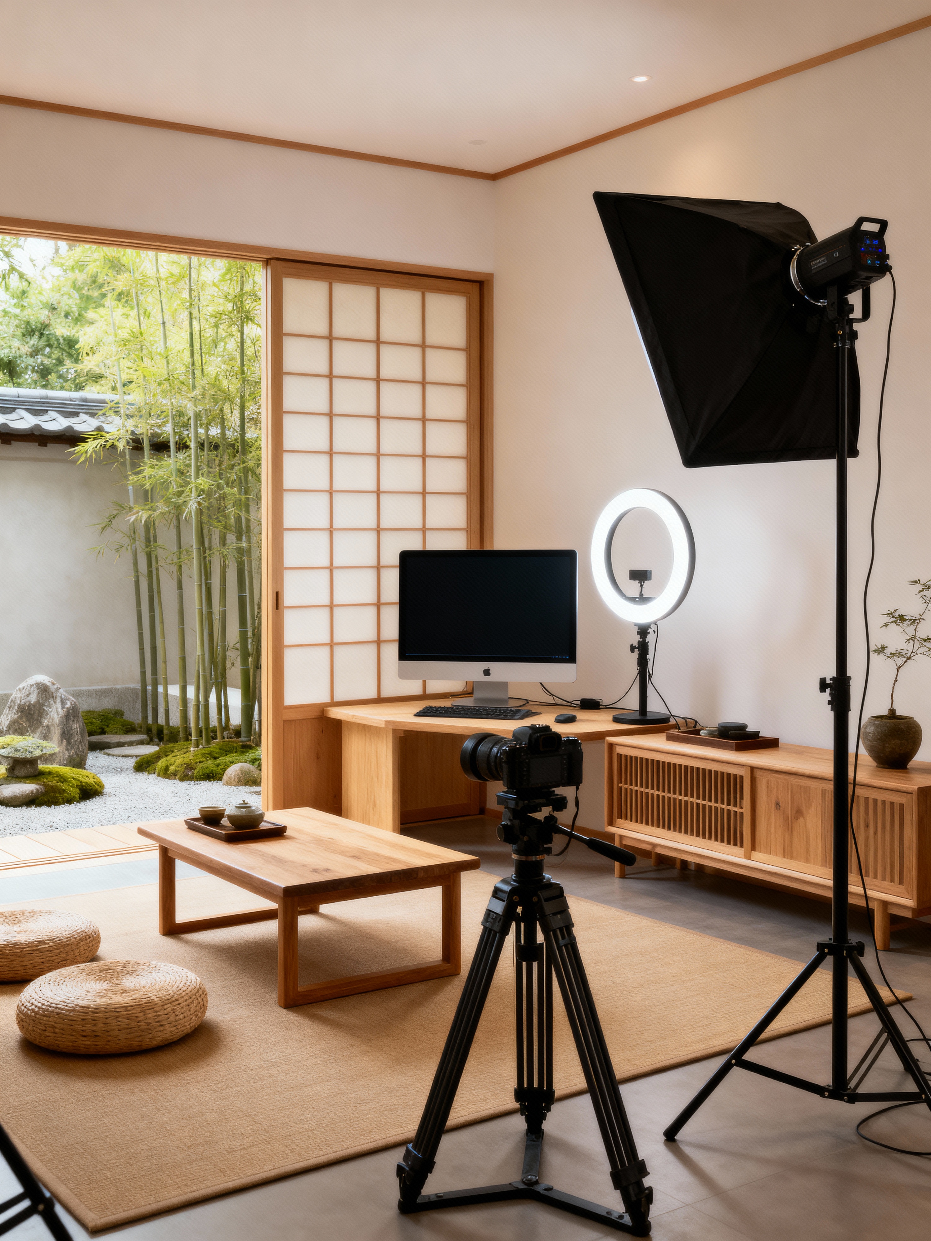 photography studio with zen style with photography studio and studio monitor and ring light and camera on tripod and professional lighting equipment and photography studio and photo shoot studio and professional photography studio. . with japanese interior and japanese minimalist interior and simple furniture and clutter free and serenity and harmony and natural light and japanese minimalist interior and natural textures
