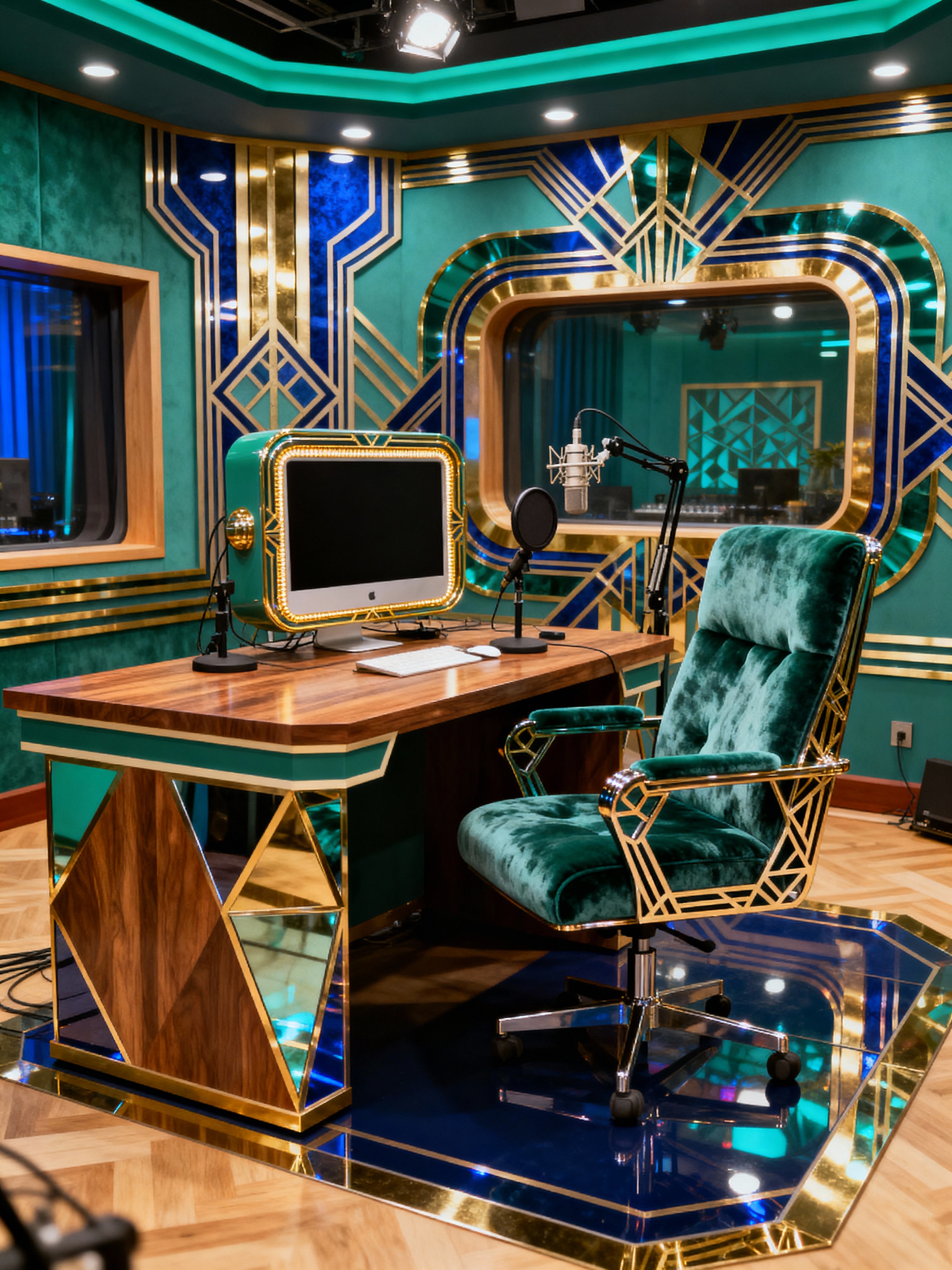 podcast studio with art deco style with talk show studio and talk show studio and radio show studio and talk show studio and computer and comfortable podcast chair and talk show interior and sturdy desk. . with geometric lines and decadent detail and bright and cheerful colors and exuberant shapes and rich colors and bold geometry and geometric shapes and abstract patterns