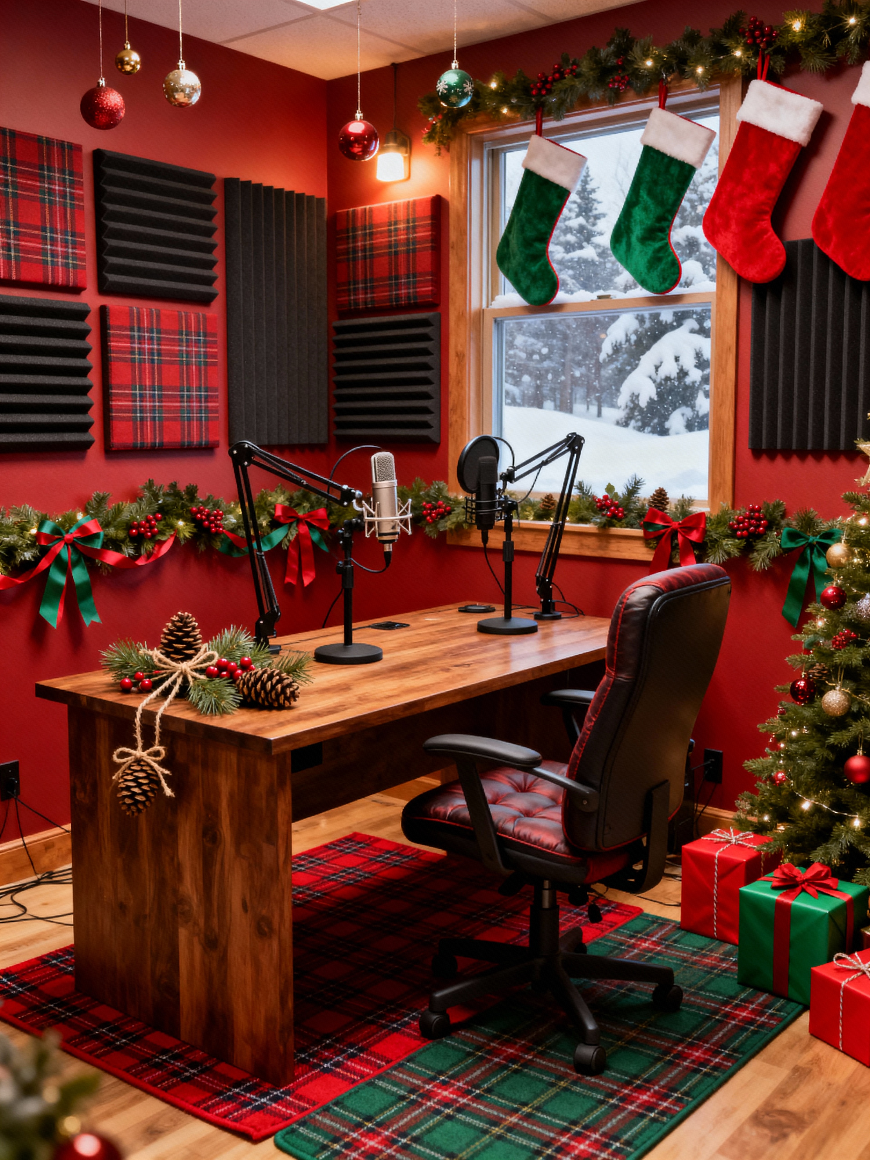 podcast studio with christmas style with acoustic soundproofing panels for damping sound and radio station studio and talk show studio and radio station studio and talk show studio and sturdy desk and 2 microphone stands and comfortable podcast chair. . with ribbons and berries and greenery draped and christmas ornaments and a few big socks hanging and snow outside and plaid rugs and tie pinecones and berries and giftwrapped gifts